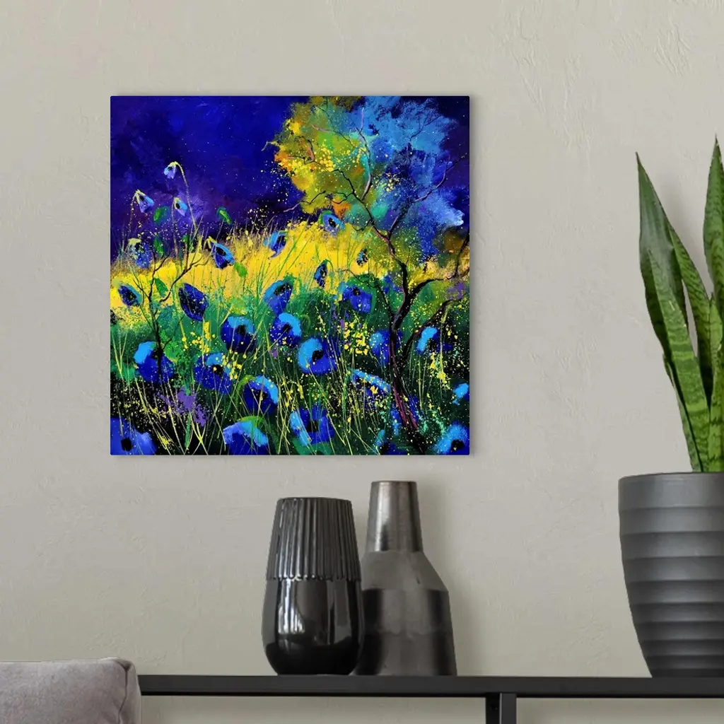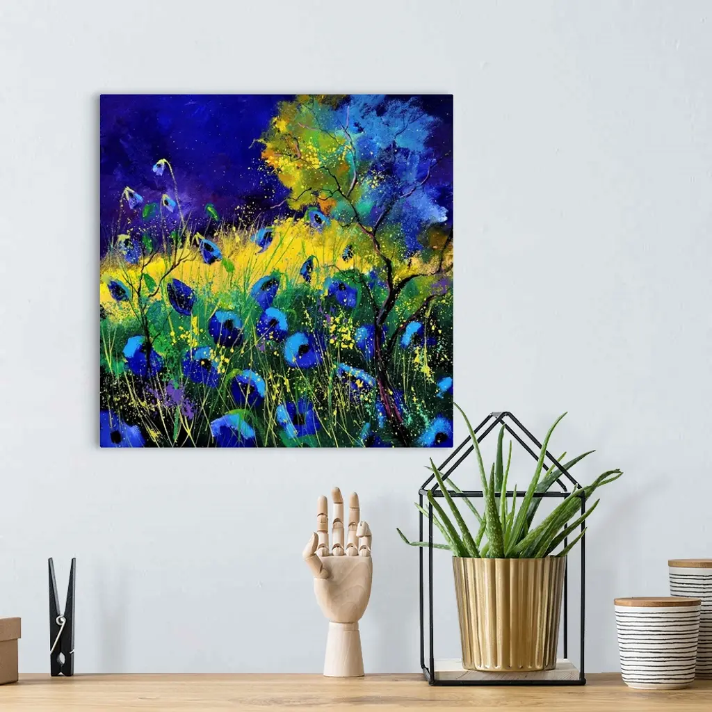 Vibrant painting of blue poppies in a filed with a dark sky.