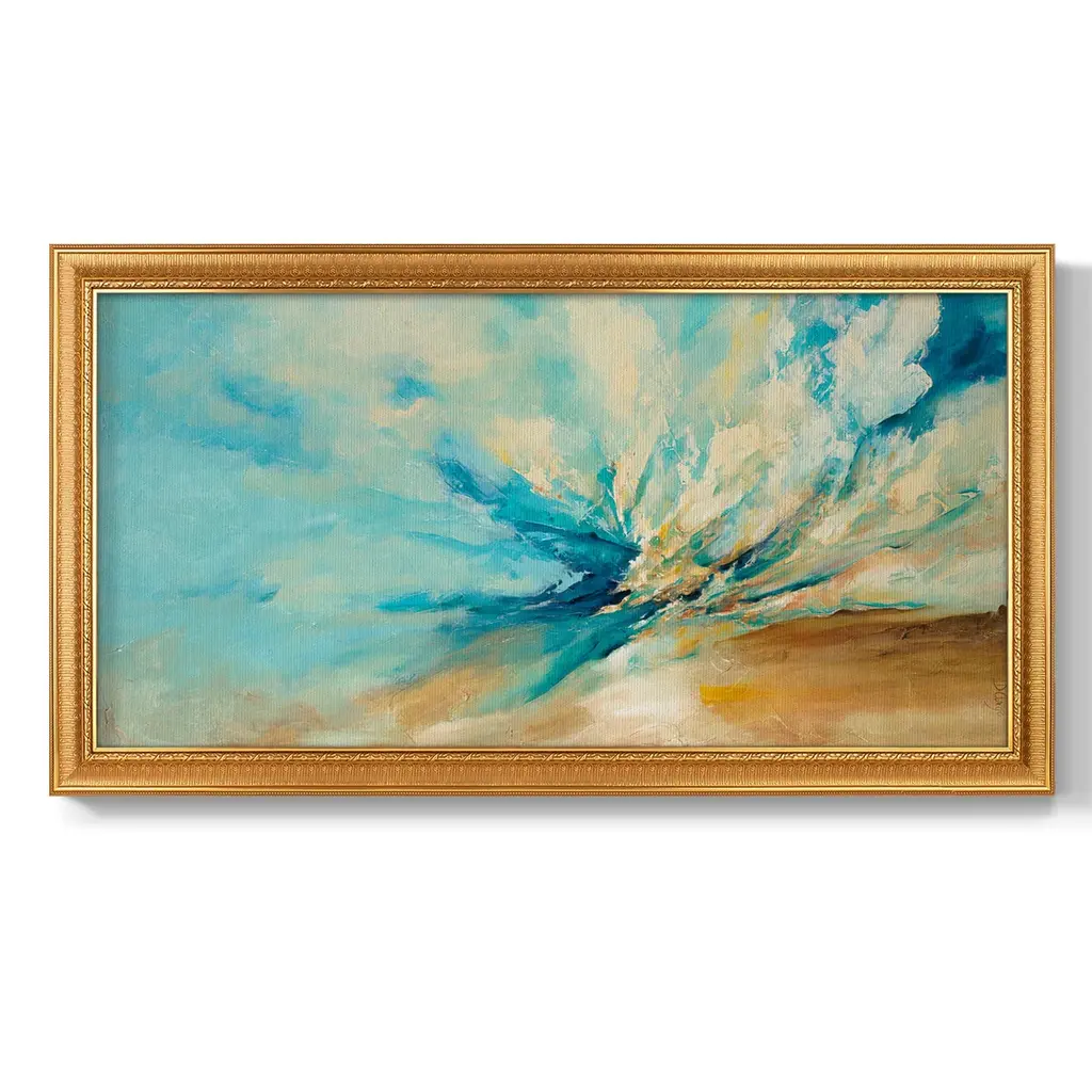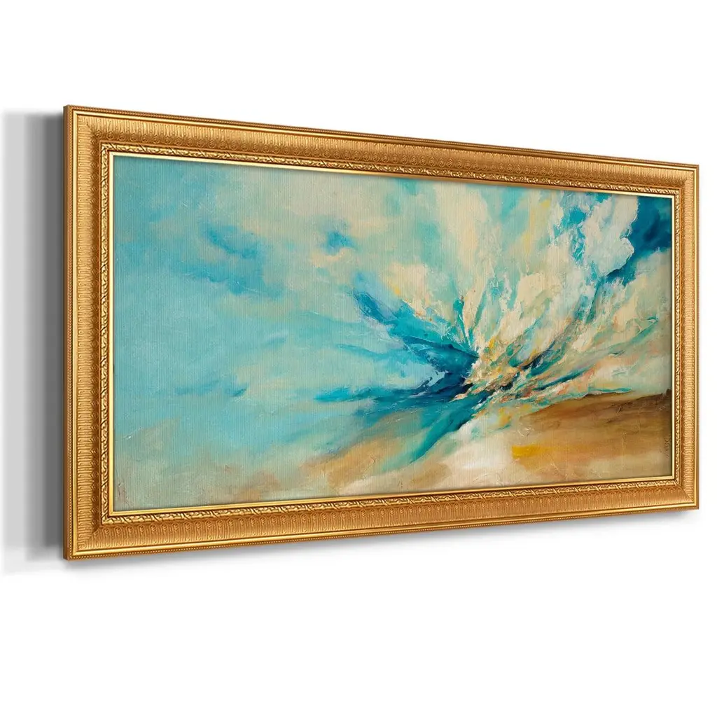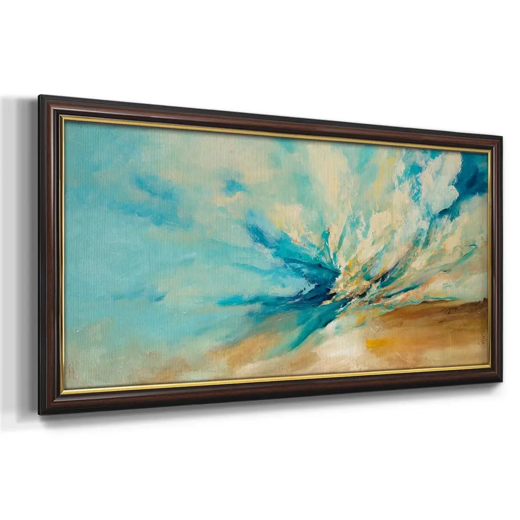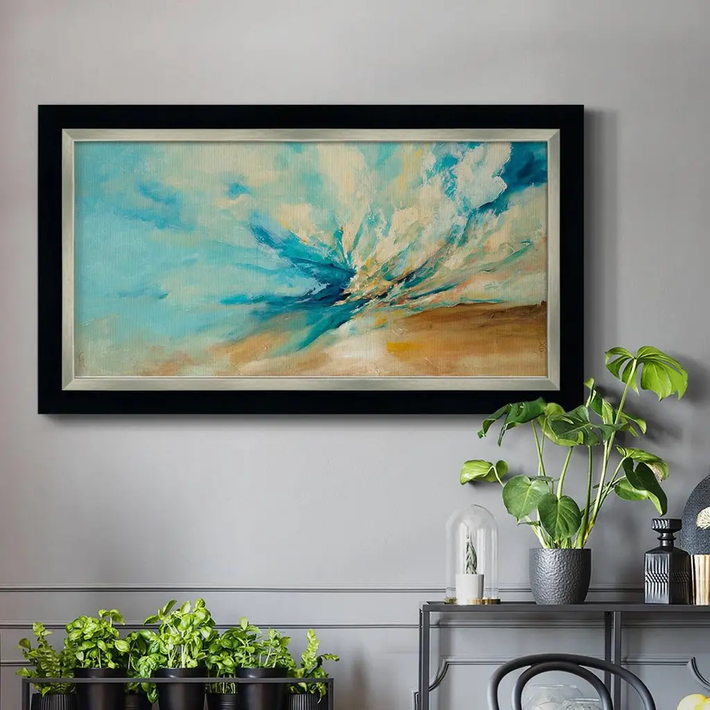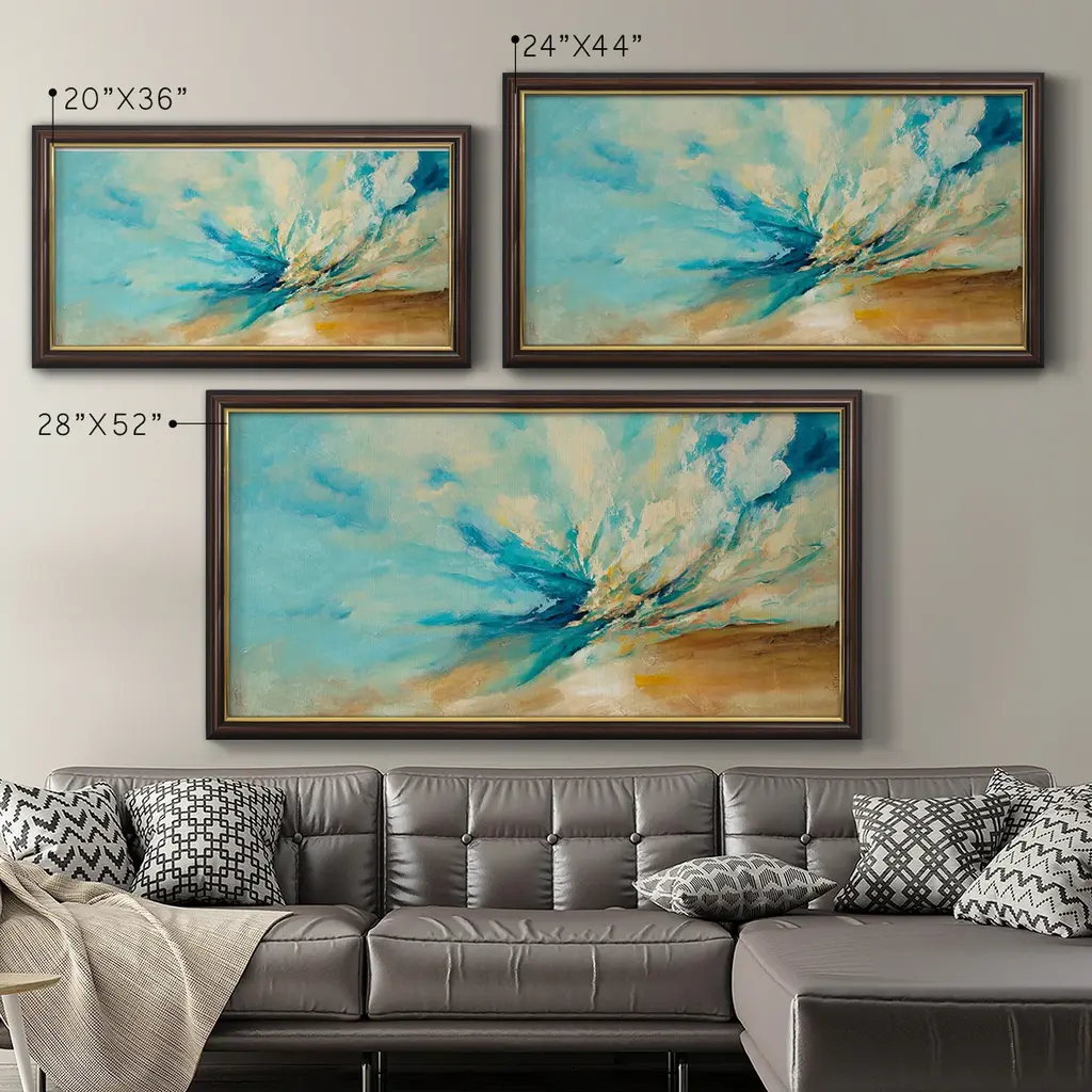 Blue Premium Framed Canvas- Ready to Hang A Premium Framed Canvas created to last. Framed in distressed wood and available in an array of sizes and colors Featuring a beveled a solid wood stretcher bar, each piece comes ready to hand 3 SIZES AVAILABLE 21''X37'' - Overall Size 25''X45'' - Overall Size 29''x53'' - Overall Size Each piece is made to order. Each piece comes with hanging hardware. Made in the USA Ready to Hang Giclee Paper Print Acrylic Glass Beveled Matt Board