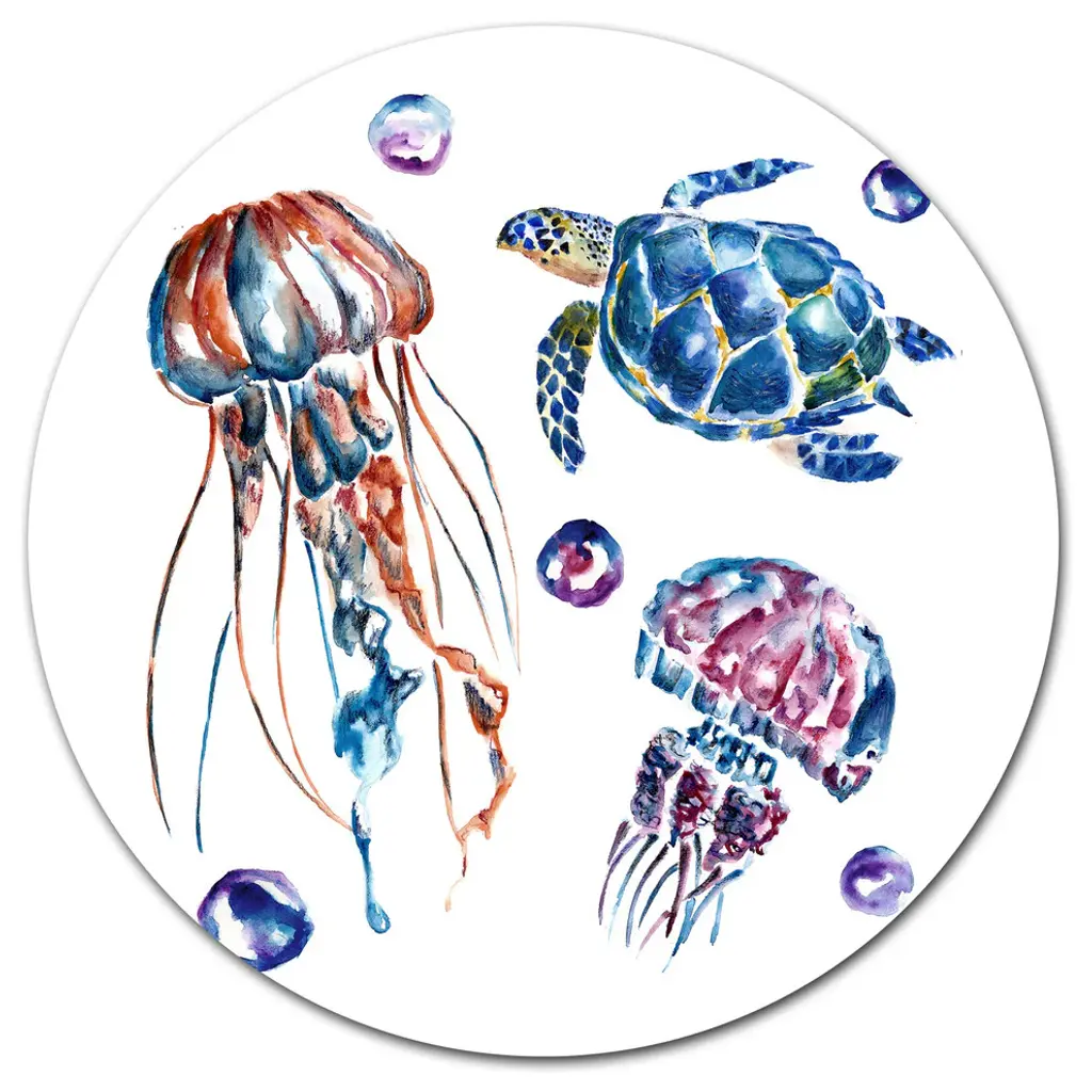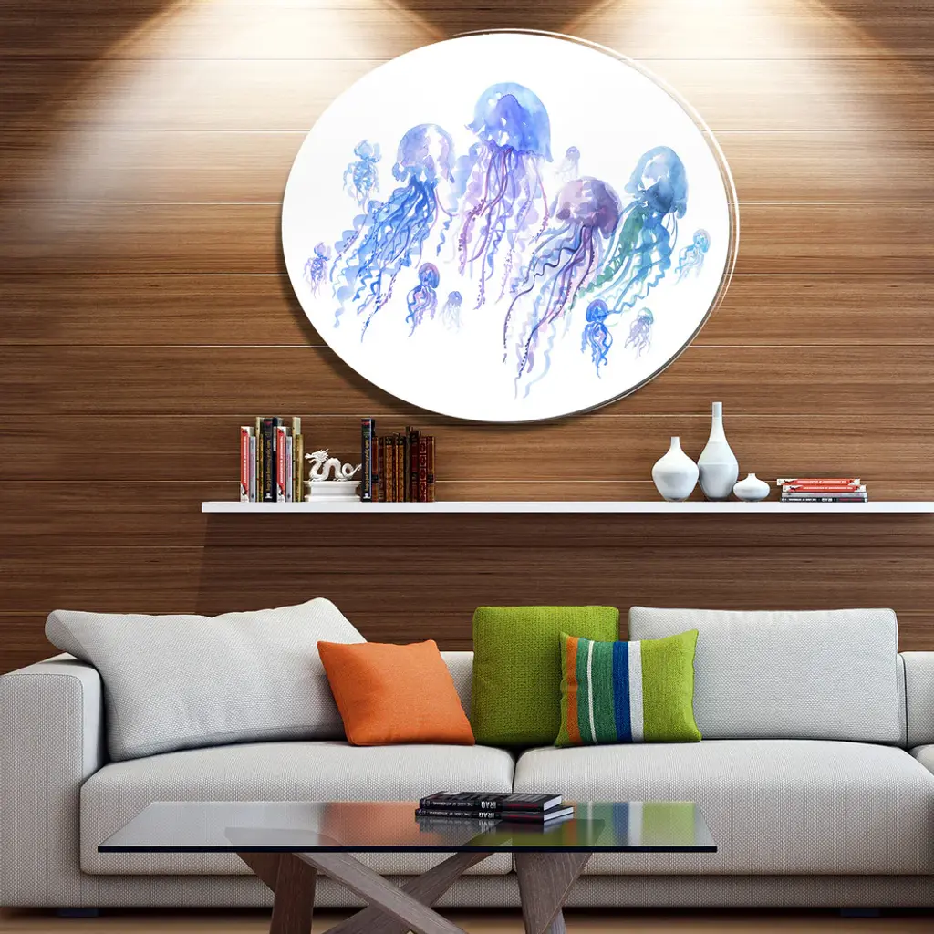 Bring Contemporary Abstraction to your home with this large Circle Metal wall art. This Blue Purple Jellyfish Group Metal Artwork makes it the focal point of any room or office. - White Gloss Coating ensures colors are extra vibrant with light reflection.- Aluminum grade Sheet Metal with 1 inch mounting frame on the back giving the illusion that the artwork is floating on the wall..- Mounting Brackets are included along with instructions.- High Quality Digital images are created directly into a glossy aluminum panel producing a stunning and captivating print into the glossy finish of the metal.- Water, Fire and Scratch resistant HD Aluminum panels.- Looks better than any photo paper and guaranteed to last at least 20 years- Easy to clean with a microfiber cloth. Colors are far superior to regular Canvas Art. - Easy to Hang