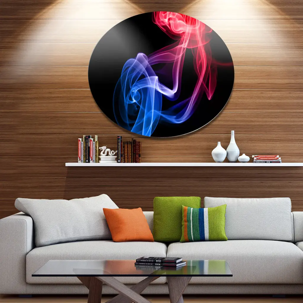 Bring Contemporary Abstraction to your home with this large Circle Metal wall art. This Blue Red Floating Smoke on Black Metal Artwork makes it the focal point of any room or office. - White Gloss Coating ensures colors are extra vibrant with light reflection.- Aluminum grade Sheet Metal with 1 inch mounting frame on the back giving the illusion that the artwork is floating on the wall..- Mounting Brackets are included along with instructions.- High Quality Digital images are created directly into a glossy aluminum panel producing a stunning and captivating print into the glossy finish of the metal.- Water, Fire and Scratch resistant HD Aluminum panels.- Looks better than any photo paper and guaranteed to last at least 20 years- Easy to clean with a microfiber cloth. Colors are far superior to regular Canvas Art. - Easy to Hang