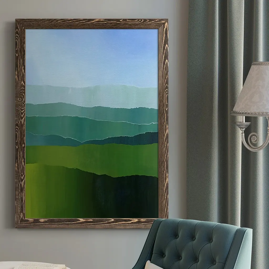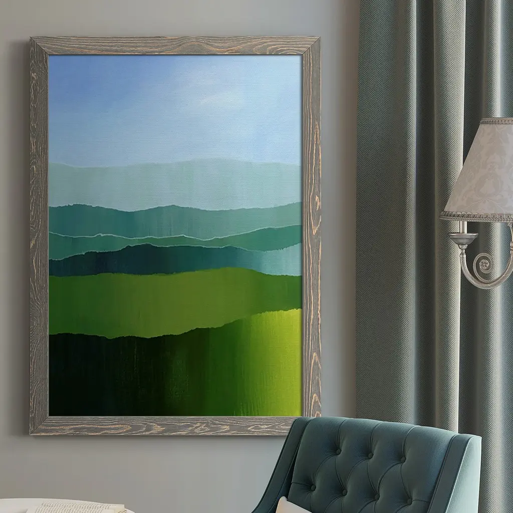 Blue Ridge Fade II Premium Framed Print - Ready to Hang A Premium Framed Print created to last. Framed in distressed wood and available in an array of sizes and colors Featuring a beveled a solid wood stretcher bar, each piece comes ready to hand 4 SIZES AVAILABLE 30.5''X42.5'' - Overall Size 26.5'X36.5'' - Overall Size 22.5''x30.5'' - Overall Size 18.5''x24.5'' - Overall Size Each piece is made to order. Each piece comes with hanging hardware. Made in the USA Ready to Hang