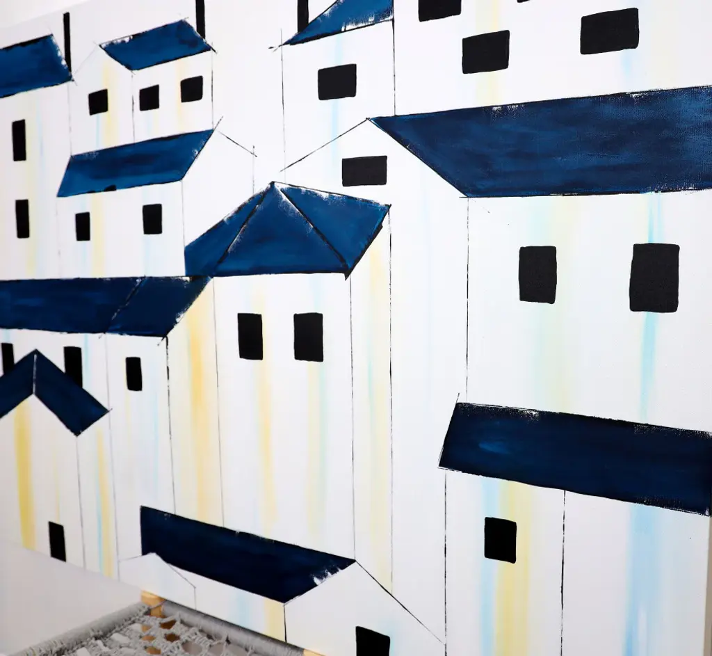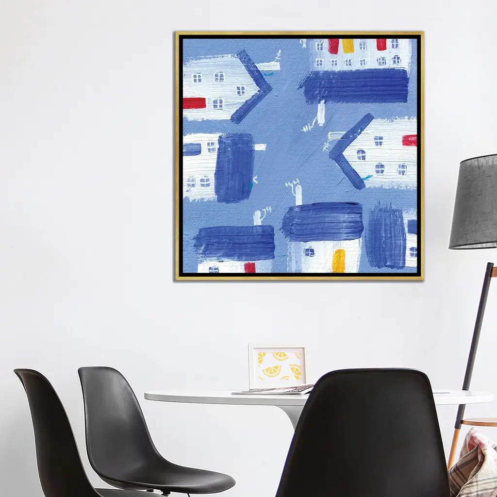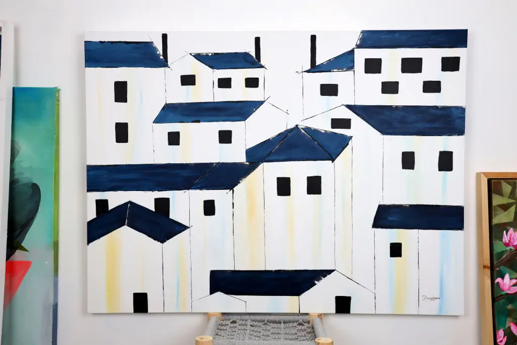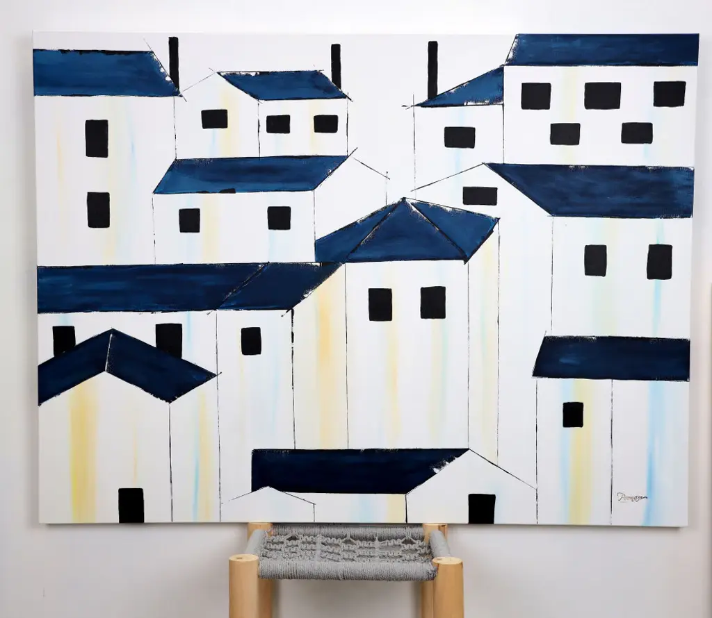 Blue Rooftop Houses, Architecture Landscape Painting, Cityscape Artwork