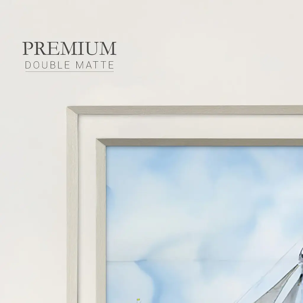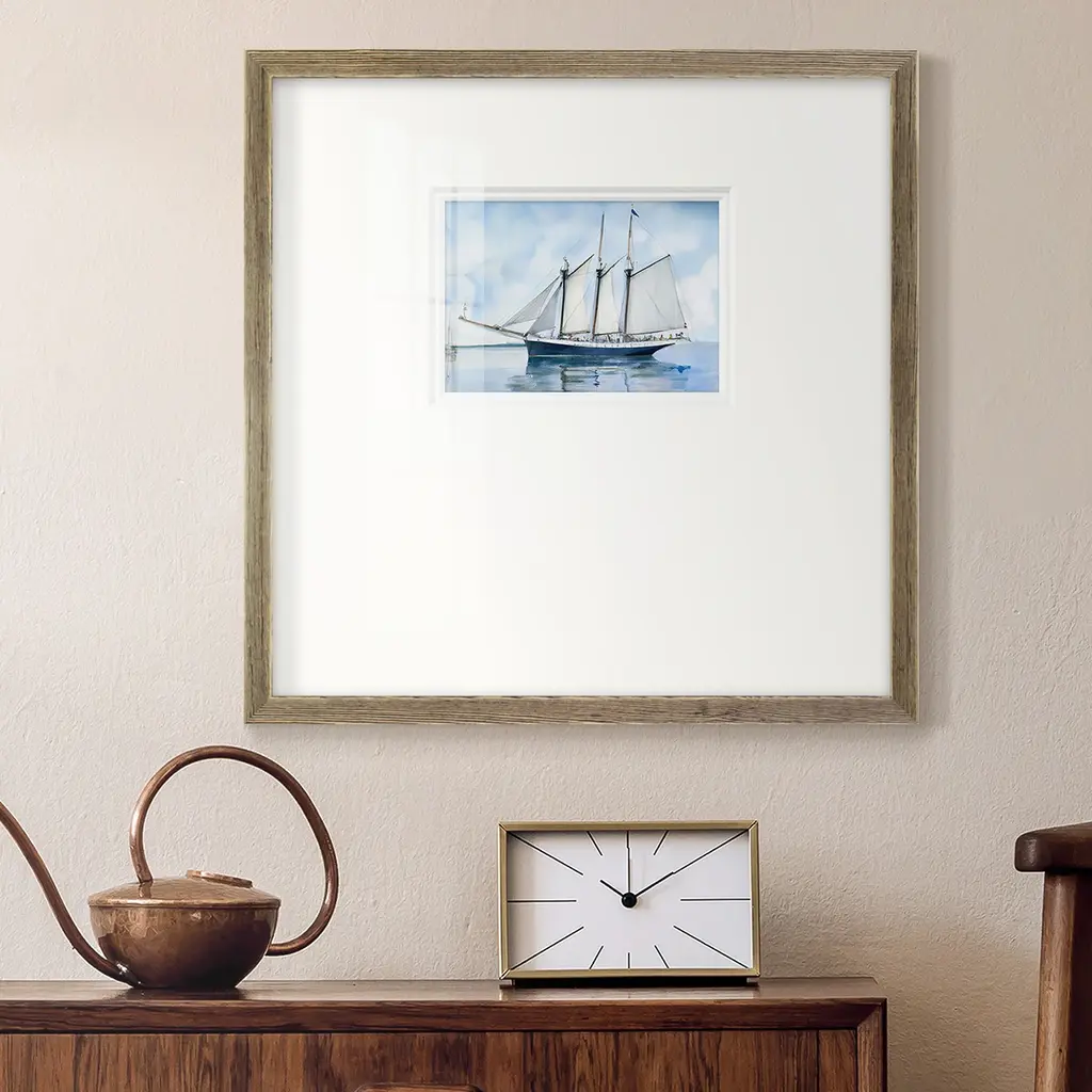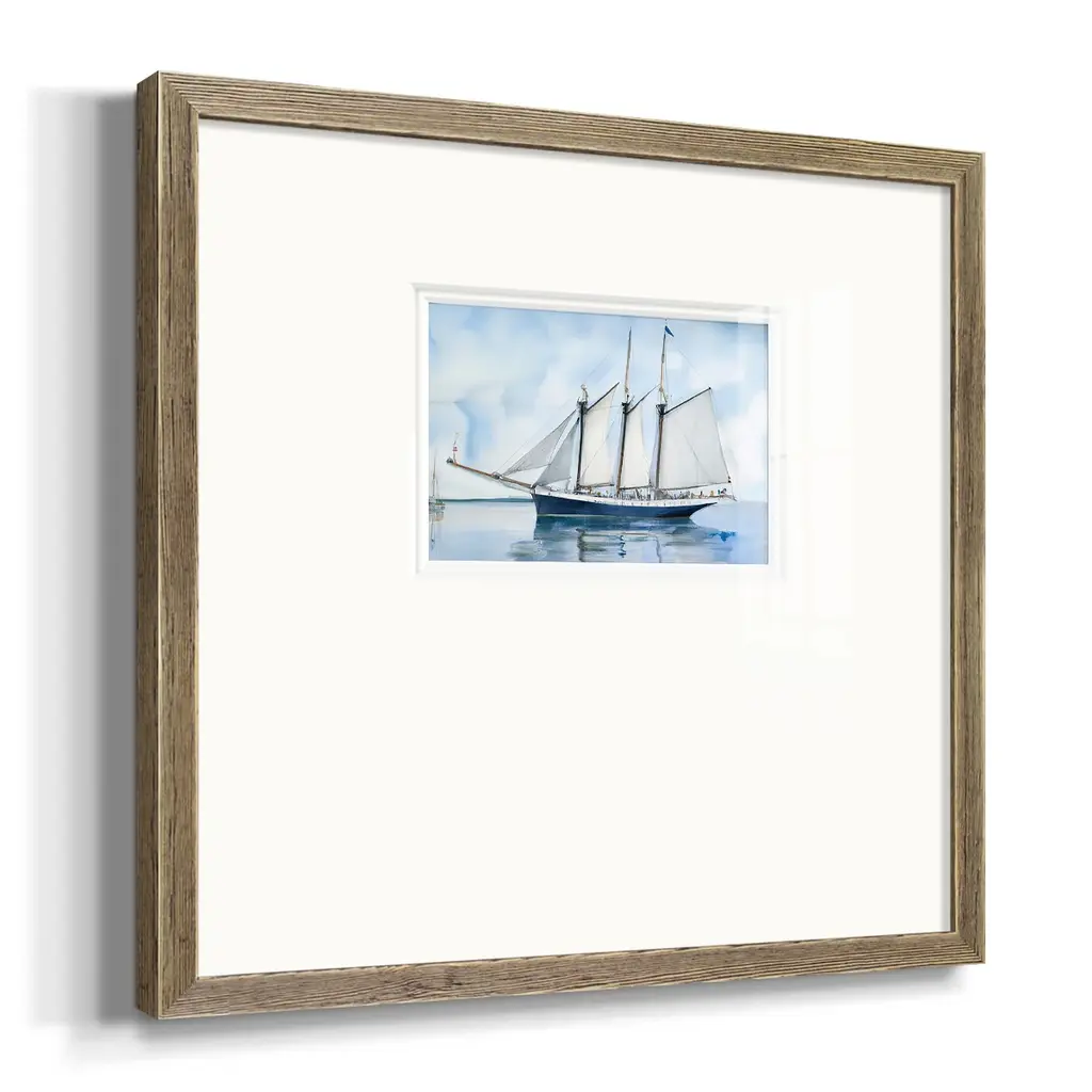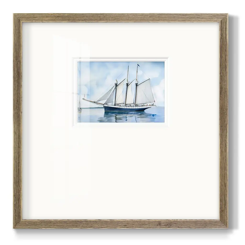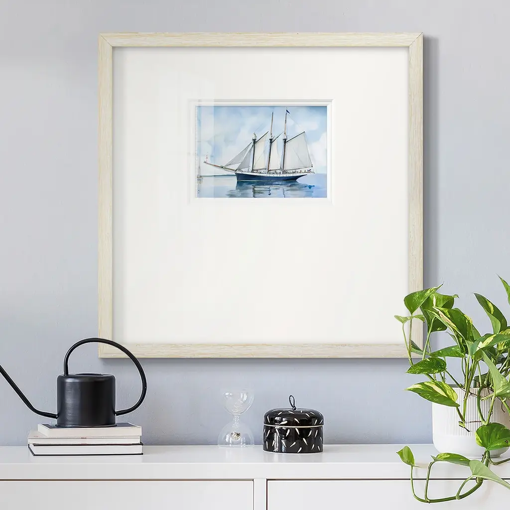 Blue SailPremium Framed Print A framed cold pressed paper print featuring superior double matting and quality frame. 2 SIZES AVAILABLE 16''X16''' - Overall Size 20''X20''' - Overall Size Each piece is made to order. Each piece comes with hanging hardware. Made in the USA Ready to Hang Giclee Paper Print Plexiglass Beveled Matt Board Double Matte Board