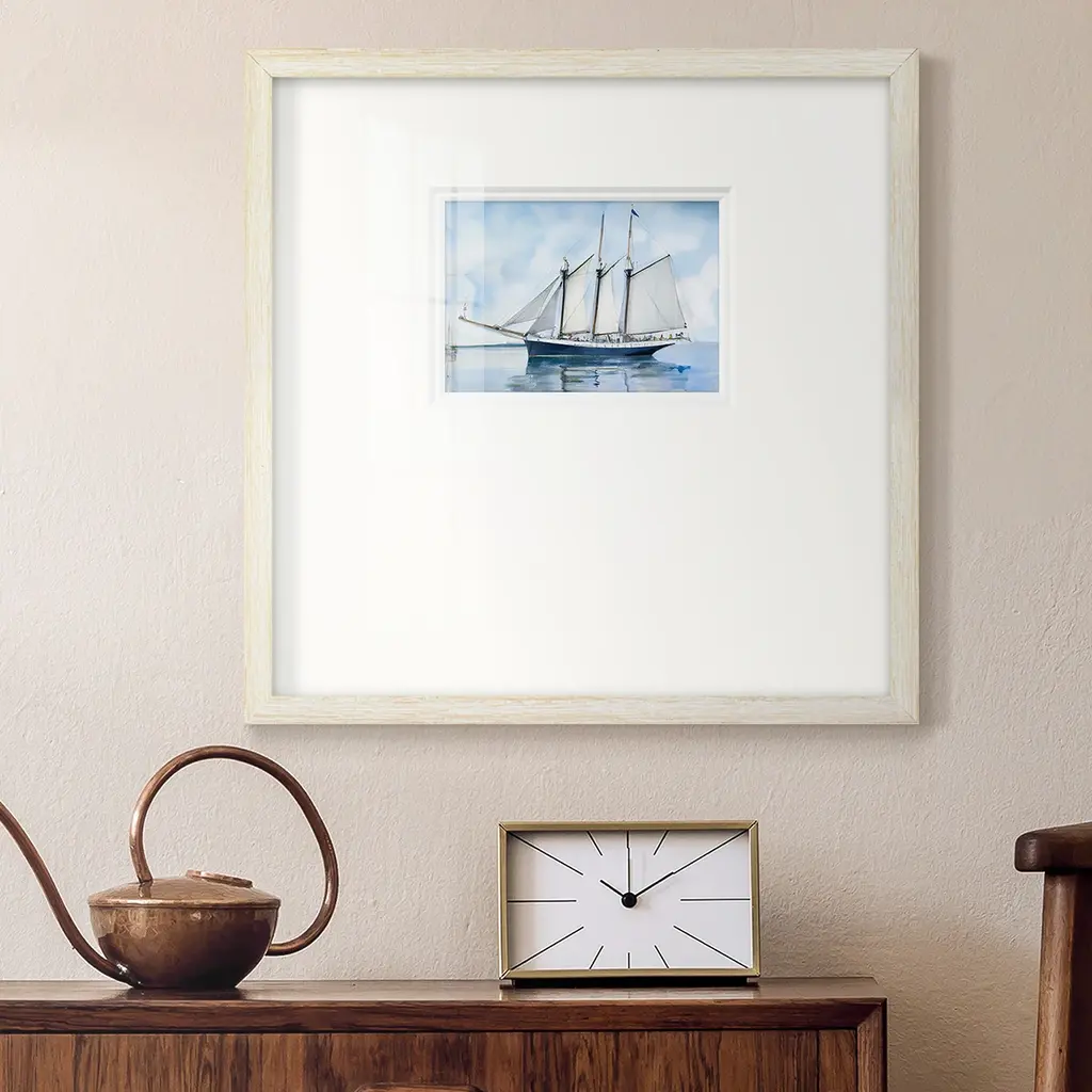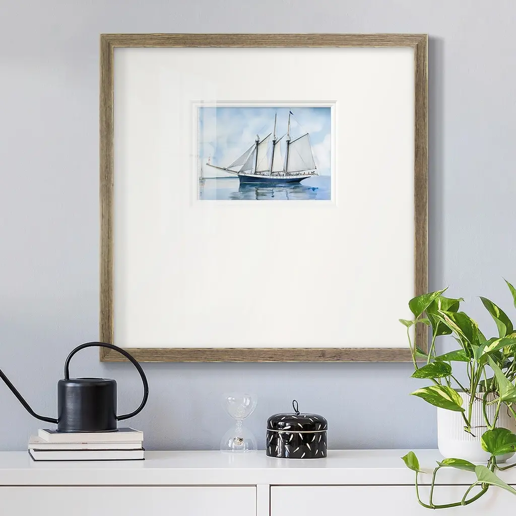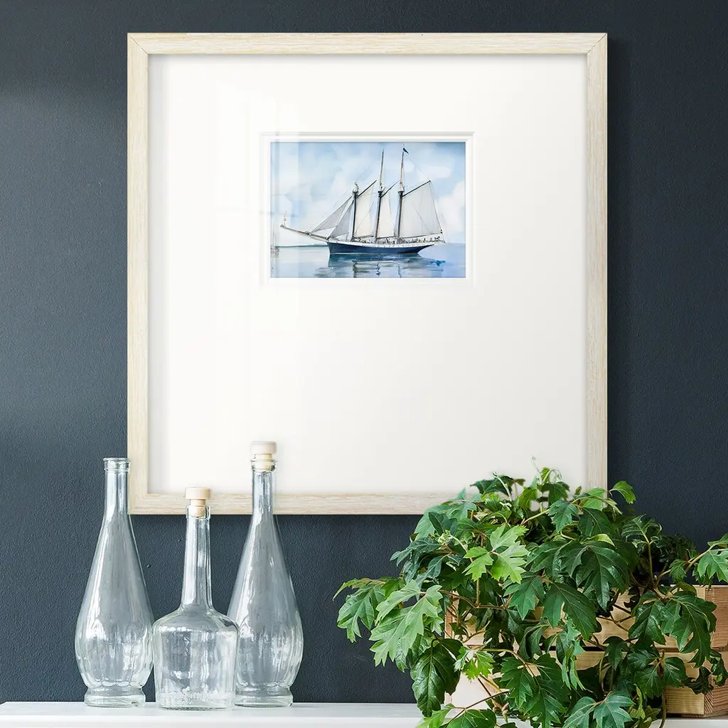 Blue SailPremium Framed Print A framed cold pressed paper print featuring superior double matting and quality frame. 2 SIZES AVAILABLE 16''X16''' - Overall Size 20''X20''' - Overall Size Each piece is made to order. Each piece comes with hanging hardware. Made in the USA Ready to Hang Giclee Paper Print Plexiglass Beveled Matt Board Double Matte Board