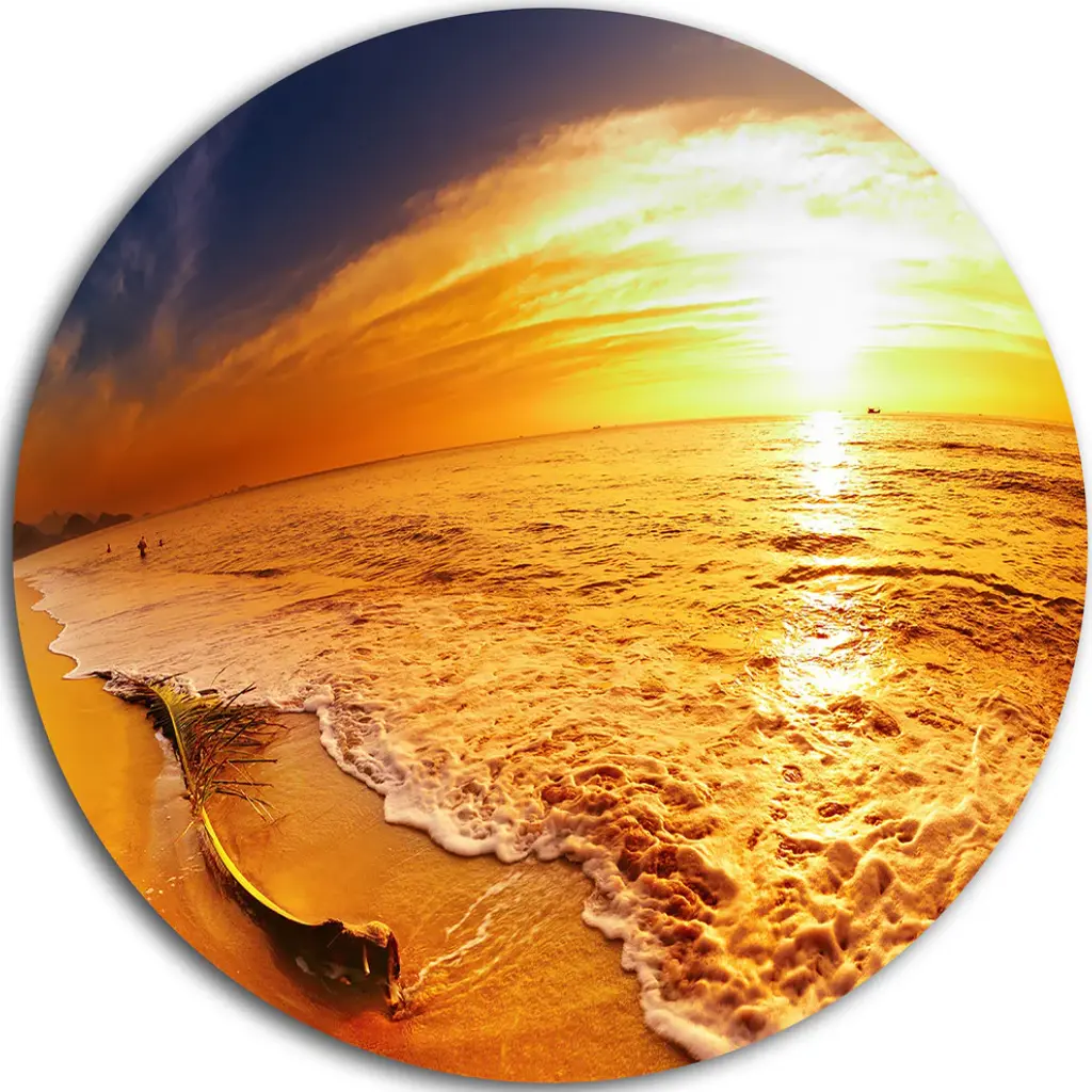 Bring Contemporary Abstraction to your home with this large Circle Metal wall art. This Blue Sea and Sky with Sandy Beach Metal Artwork makes it the focal point of any room or office. - White Gloss Coating ensures colors are extra vibrant with light reflection.- Aluminum grade Sheet Metal with 1 inch mounting frame on the back giving the illusion that the artwork is floating on the wall..- Mounting Brackets are included along with instructions.- High Quality Digital images are created directly into a glossy aluminum panel producing a stunning and captivating print into the glossy finish of the metal.- Water, Fire and Scratch resistant HD Aluminum panels.- Looks better than any photo paper and guaranteed to last at least 20 years- Easy to clean with a microfiber cloth. Colors are far superior to regular Canvas Art. - Easy to Hang