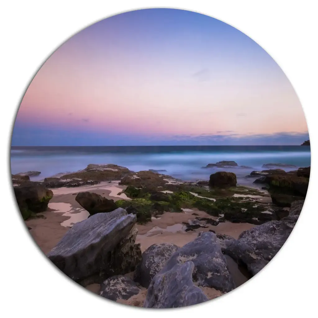 Bring Contemporary Abstraction to your home with this large Circle Metal wall art. This Blue Sea Sunset on Sandy Coastline Metal Artwork makes it the focal point of any room or office. - White Gloss Coating ensures colors are extra vibrant with light reflection.- Aluminum grade Sheet Metal with 1 inch mounting frame on the back giving the illusion that the artwork is floating on the wall..- Mounting Brackets are included along with instructions.- High Quality Digital images are created directly into a glossy aluminum panel producing a stunning and captivating print into the glossy finish of the metal.- Water, Fire and Scratch resistant HD Aluminum panels.- Looks better than any photo paper and guaranteed to last at least 20 years- Easy to clean with a microfiber cloth. Colors are far superior to regular Canvas Art. - Easy to Hang