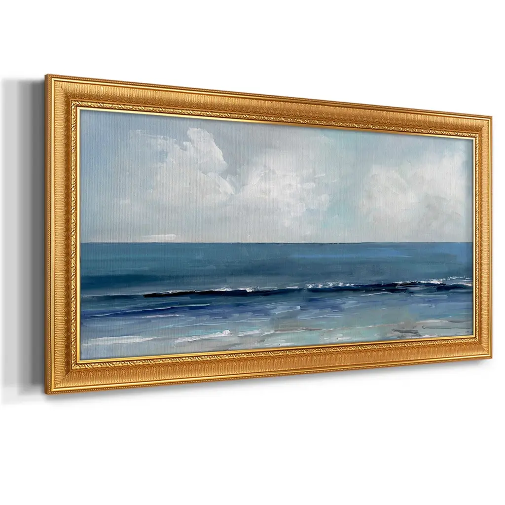 Blue Seas Premium Framed Canvas- Ready to Hang A Premium Framed Canvas created to last. Framed in distressed wood and available in an array of sizes and colors Featuring a beveled a solid wood stretcher bar, each piece comes ready to hand 3 SIZES AVAILABLE 21''X37'' - Overall Size 25''X45'' - Overall Size 29''x53'' - Overall Size Each piece is made to order. Each piece comes with hanging hardware. Made in the USA Ready to Hang Giclee Paper Print Acrylic Glass Beveled Matt Board