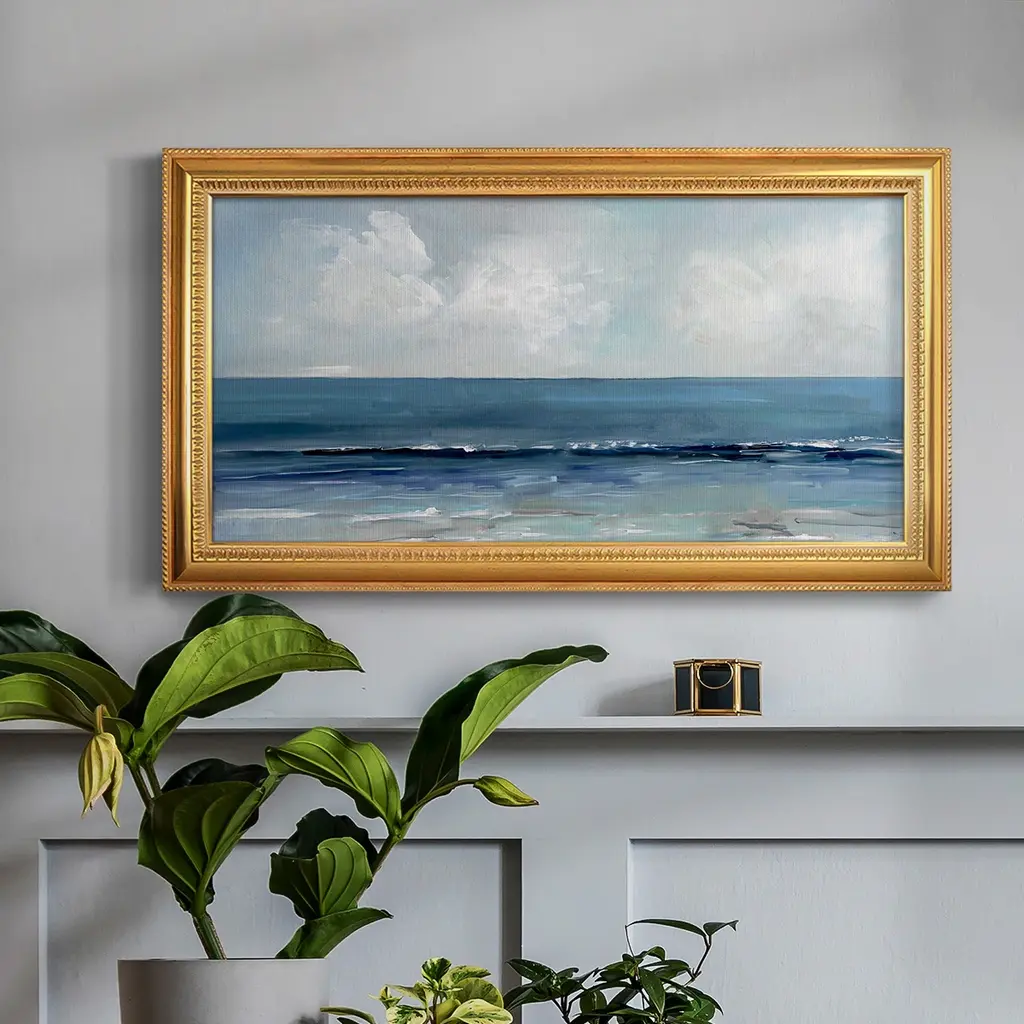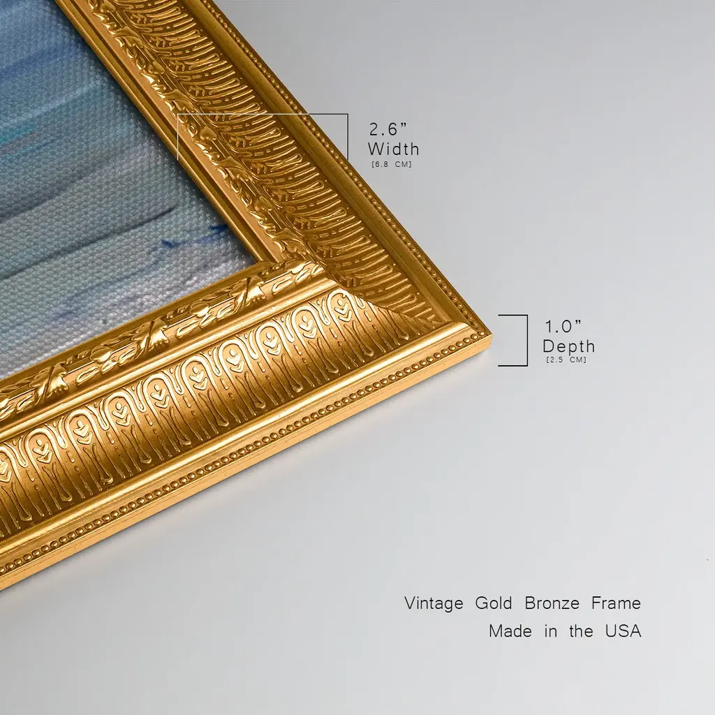Blue Seas Premium Framed Canvas- Ready to Hang A Premium Framed Canvas created to last. Framed in distressed wood and available in an array of sizes and colors Featuring a beveled a solid wood stretcher bar, each piece comes ready to hand 3 SIZES AVAILABLE 21''X37'' - Overall Size 25''X45'' - Overall Size 29''x53'' - Overall Size Each piece is made to order. Each piece comes with hanging hardware. Made in the USA Ready to Hang Giclee Paper Print Acrylic Glass Beveled Matt Board