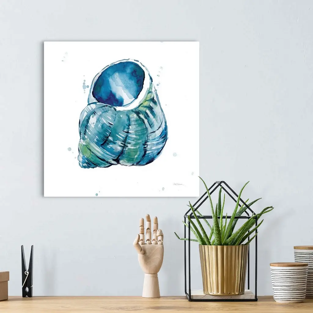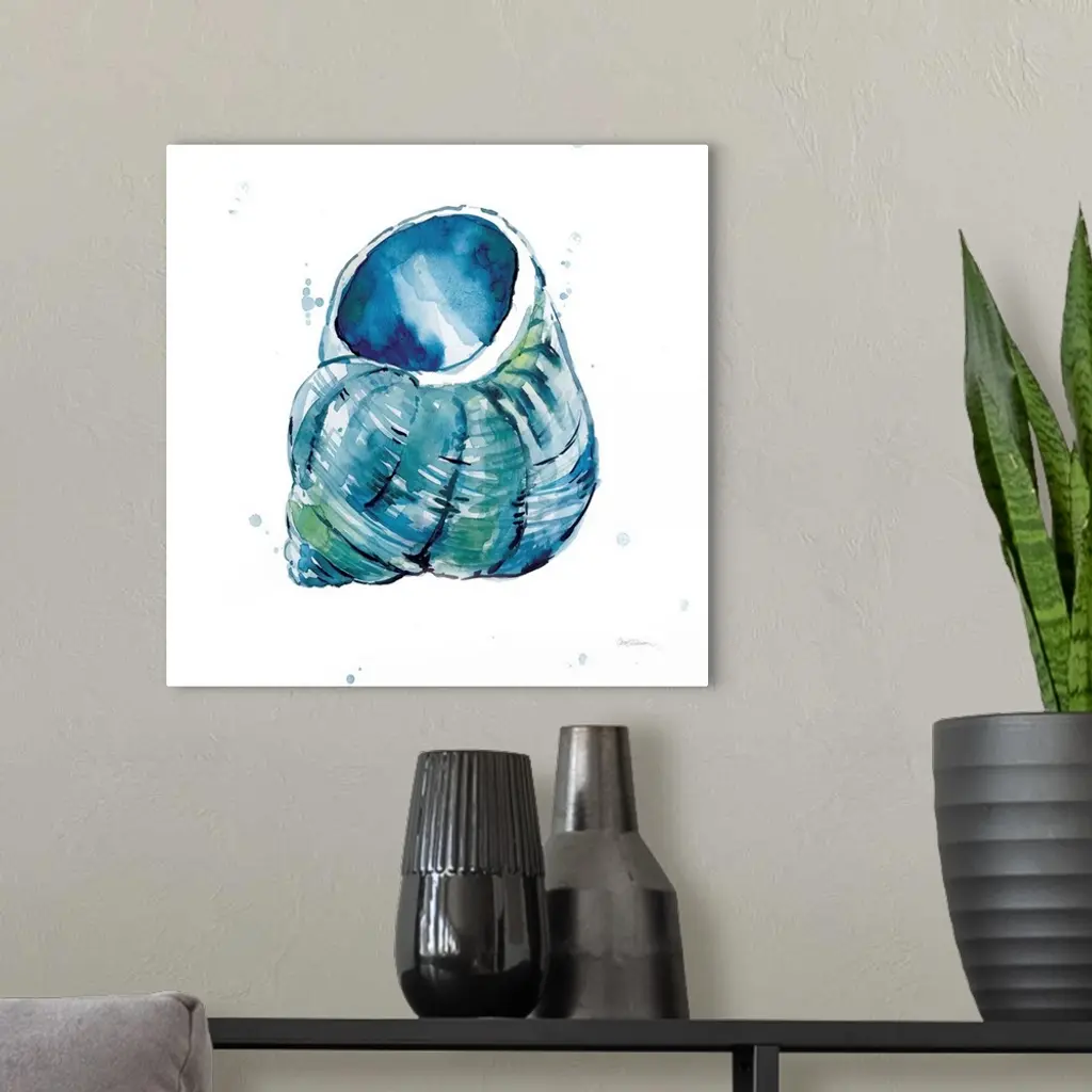 Square watercolor painting of a seashell made in shades of blue with hints of green on a white background with a little bit of paint splatter.