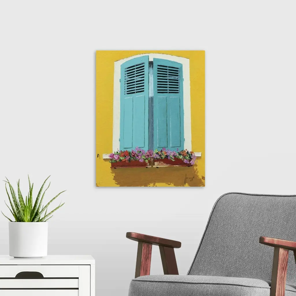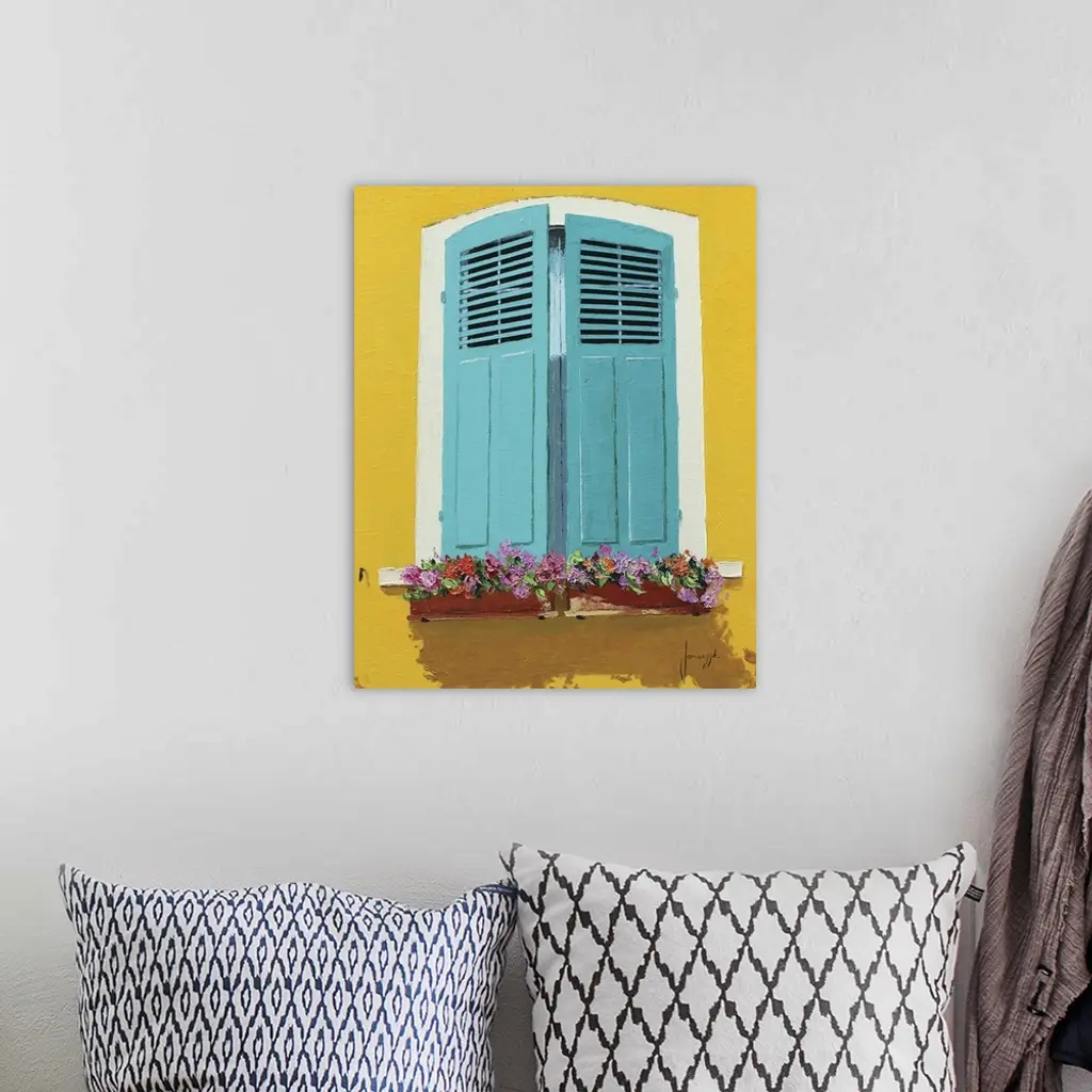 Contemporary painting of a bright yellow wall with blue shutters and flower boxes.