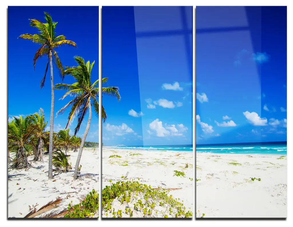 72"œ x 36"œ total size. Ready To Hang! (3 pieces - 24"œ x 36"œ each). 3 Panel Split (Triptych) Metal Print of Blue skies & Palm trees on tropical island beac. Modern metal wall art for home or office wall decor & interior design. Printed on Luxurious, HD aluminum glossy metal panels. Multi panel art.. HD aluminum panels. Metal print wall art. Includes Shadow Wall Mount on the back.• Aluminum Metal Wall Art• Made in USA• Ready to hang - No assembly required• Shadow mount hardware on the back• 0.045"œ thick HD Aluminum Panels• Scratch resistant, glossy finish• Superb color clarity, luxurious prints• Epson printing process• For indoor or moisture rich environment use• Easy to clean. Gently wipe with microfiber cloth.