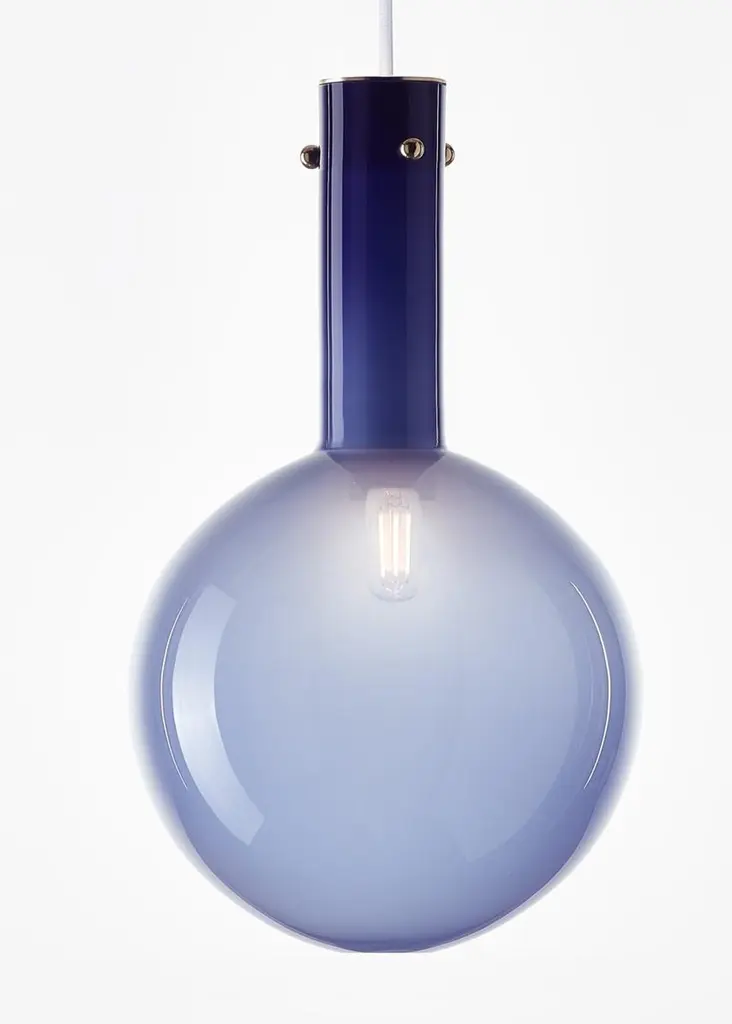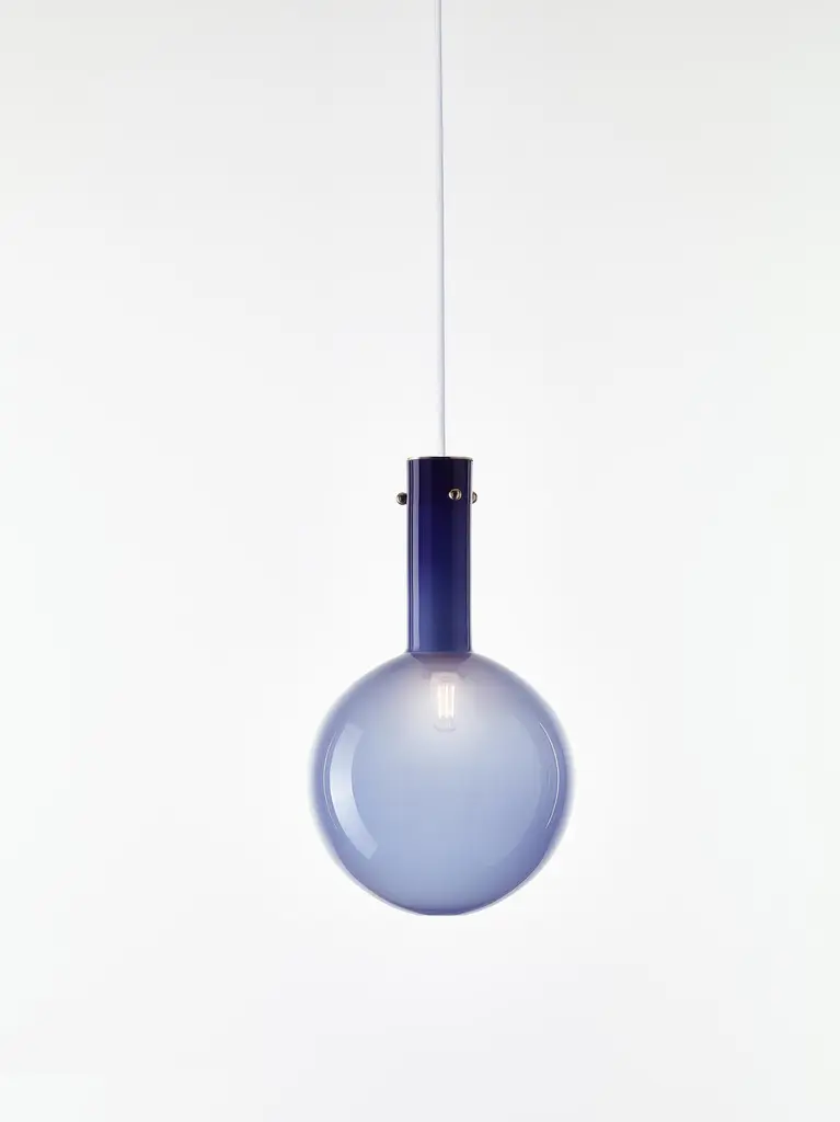 Blue Sphaerae pendant light by Dechem StudioDimensions: D 20 x H 180 cmMaterials: brass, metal, glass.Also available: different finishes and colors available.Only one homogenous piece of hand-blown glass creates the main body of Sphaerae light fixture whose medium-sized sphere is connected with the cylinder in its upper part. While the sphere is largely illuminated, the cylinder is not, creating a beautiful contrast of forms and various colour qualities. The model, available in various bright colours, also features a delicate detail of three brass balls on the fixture itself.Glass, just like people or trees, is perfectly capable of being shaped and formed. One can imprint just about anything into it, give it a form, capture a passing moment, breath a new life into it. Later it stiffens and freezes like a petrified fossil, like magma, like a witness. No one can move it. It is solid as a rock and if you urge it, it rather shatters into pieces than to surrender.We are DECHEM.We are Michaela and Jakub, designers and storytellers in Bohemian glass. Our work is based on contemporary design combined with a mastery of production and a healthy respect for old Central European craft and traditions.We design, produce and sell our collections of lights and decorative glass products. We produce unique light fixtures made from a combination of mouth-blown glass and handcrafted brass. Our glamorous chandeliers light up any space with a playful yet elegant appearance.A significant component of our work is blowing glass into a colour gradient. The wide range of fresh gradient colours is a distinctive feature of the Bandaska vase from our collection. It draws inspiration from traditional milk containers, well-known in Czech village households, and their elegant lines are now coming into modern homes in the form of our glass vases and lights.In addition to our normal production, we love to devise bespoke luminous objects for interiors. They arise from experimenting with unconventional materials and unusual combinations.Along with our own work, we like to be part of special collaborations and exhibitions. We have collaborated with renowned galleries and institutions, and curated and exhibited projects in Milano, London, Frankfurt, Istanbul and several other cities around the world.All of our creations are manufactured with care in Czech workshops using unique methods, including hand-blowing, snapping, cutting, grinding, firing, engraving and glass painting.We founded DECHEM studio in Prague in 2012 as partners in both work and life after years of studying glass craft and design, and we have grown it into a renowned and award-winning design studio.