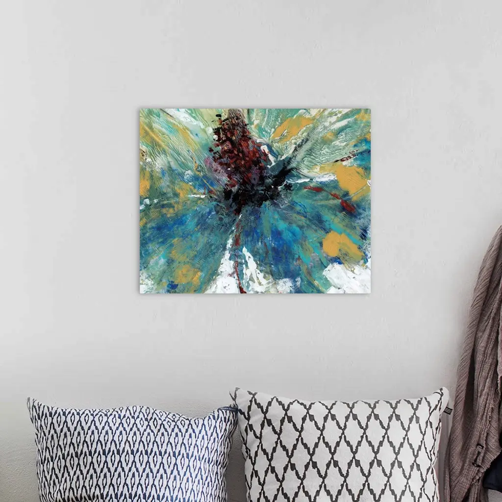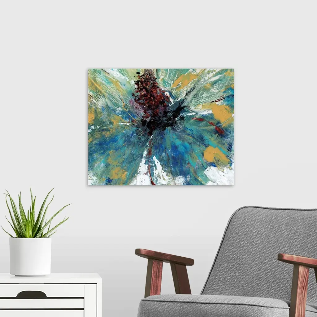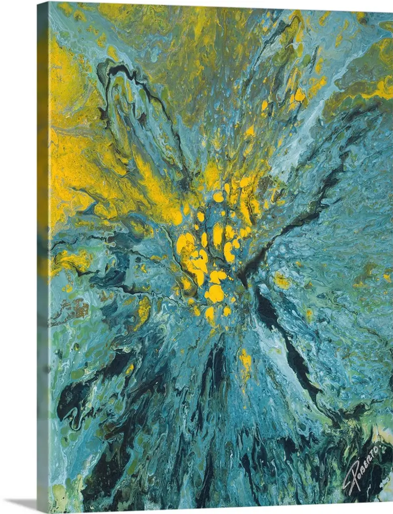 Abstract contemporary artwork in shades of blue, gold, and green.
