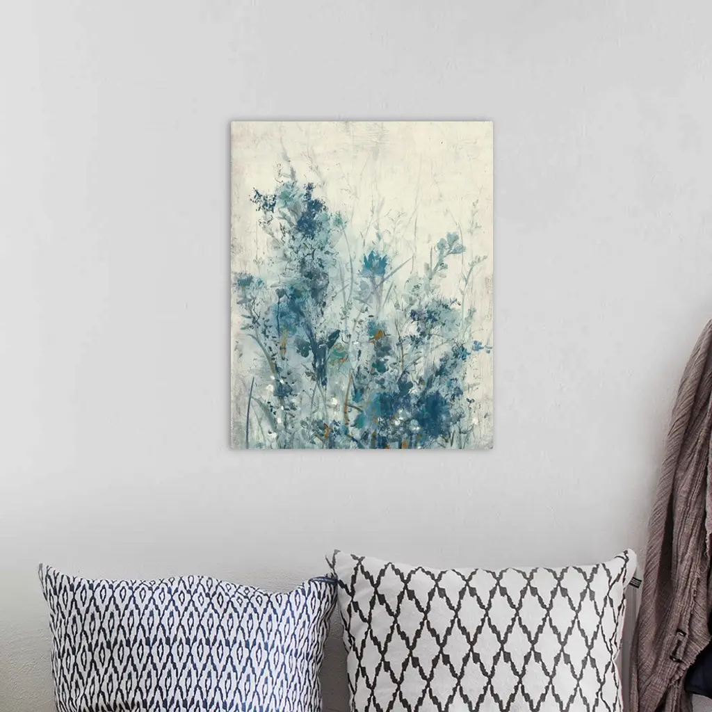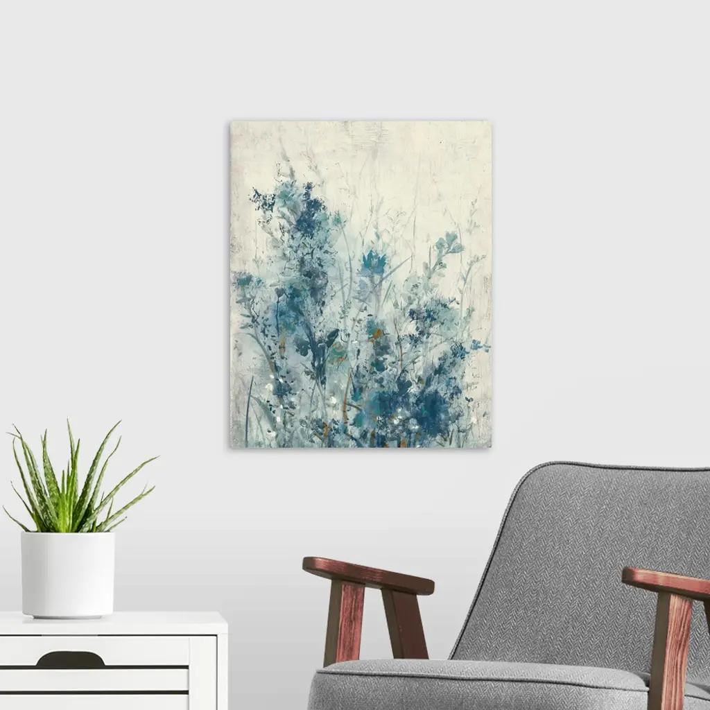 Vertical contemporary painting of a garden of spring flowers in different shades of blue.