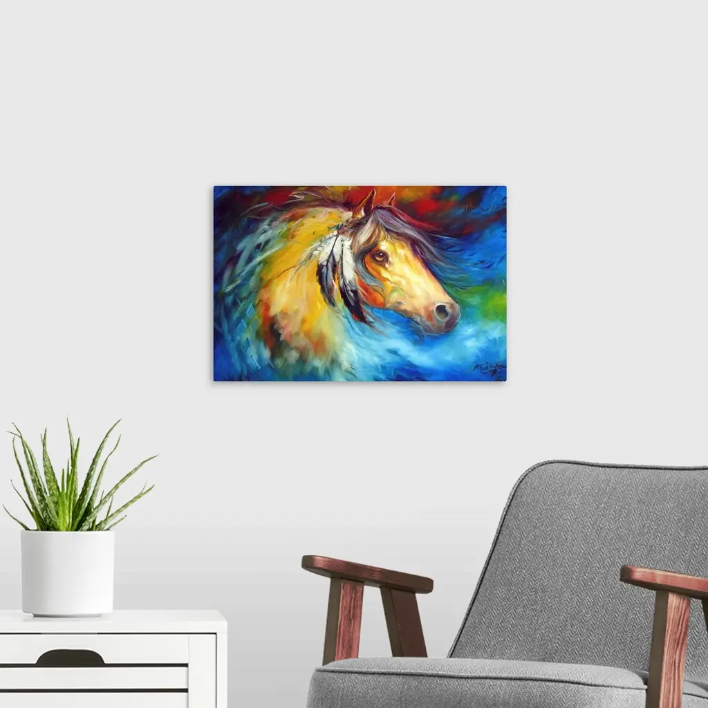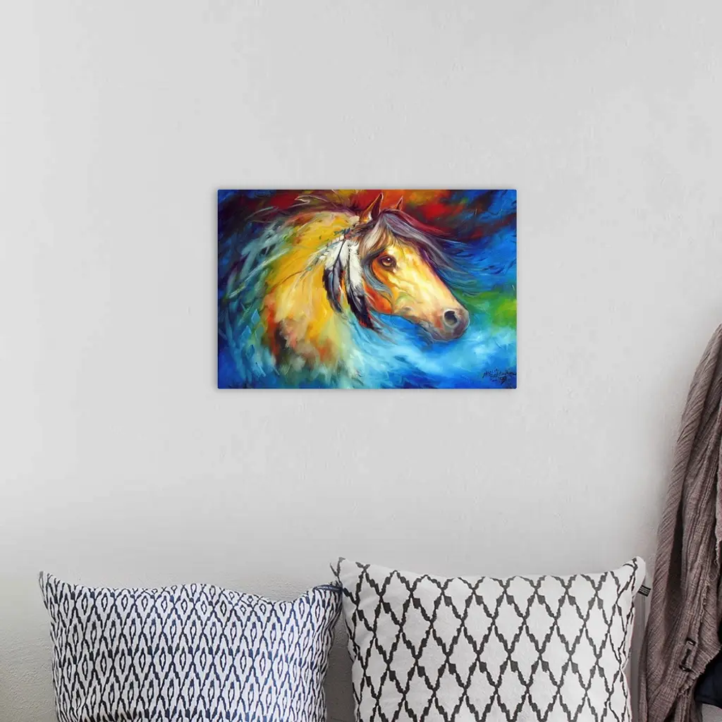 Abstract painting of an Indian War Pony with feathers attached to its mane on a colorful background.