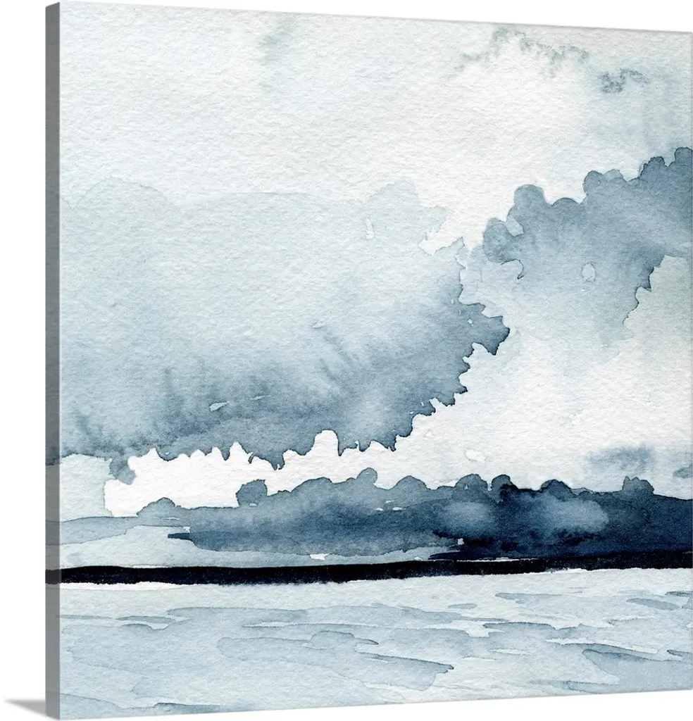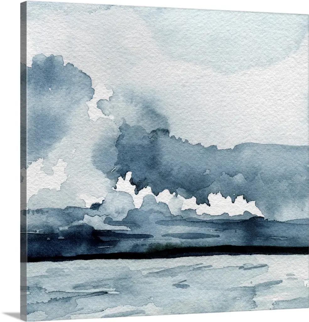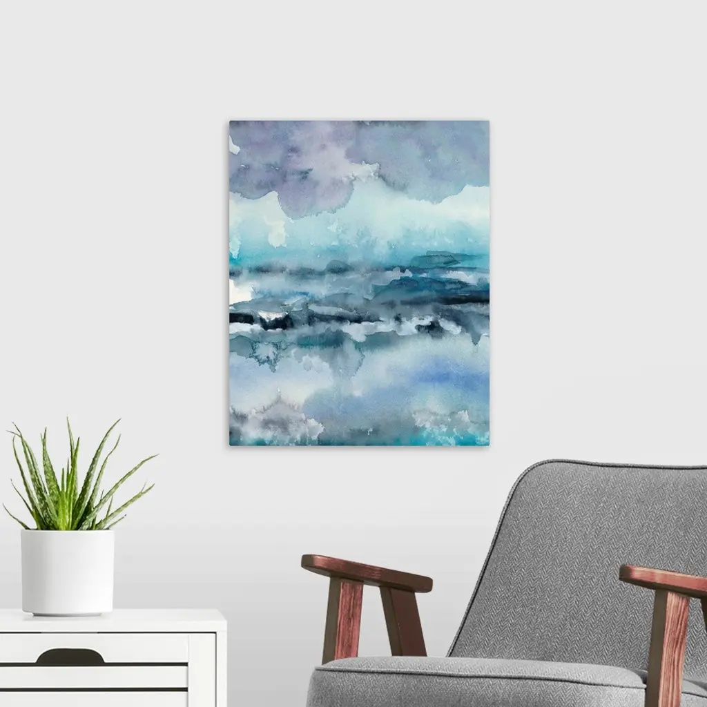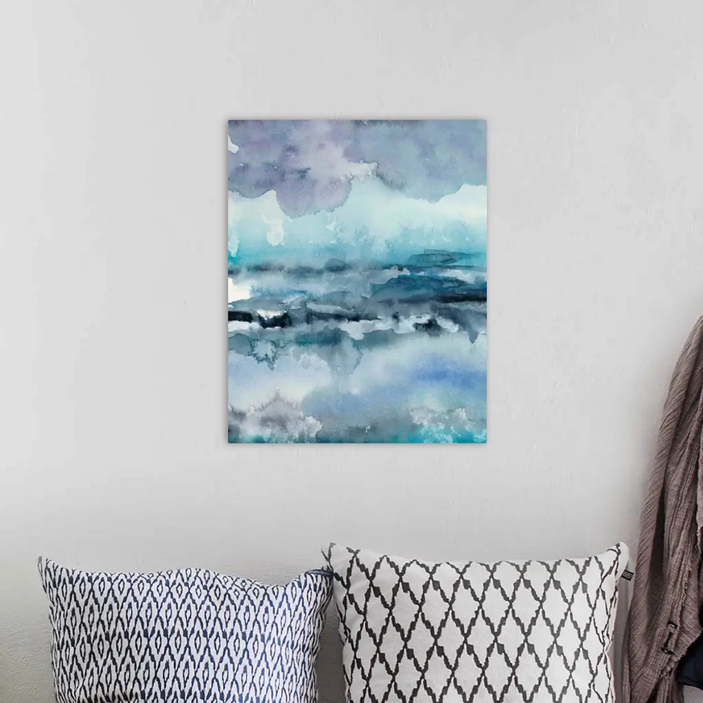 This vertical abstract watercolor painting contains shades of blue, purple and teal.