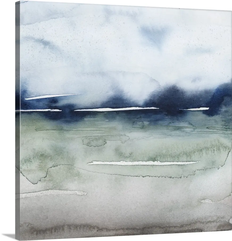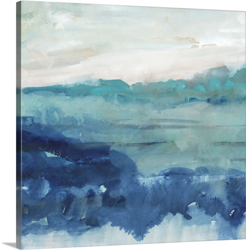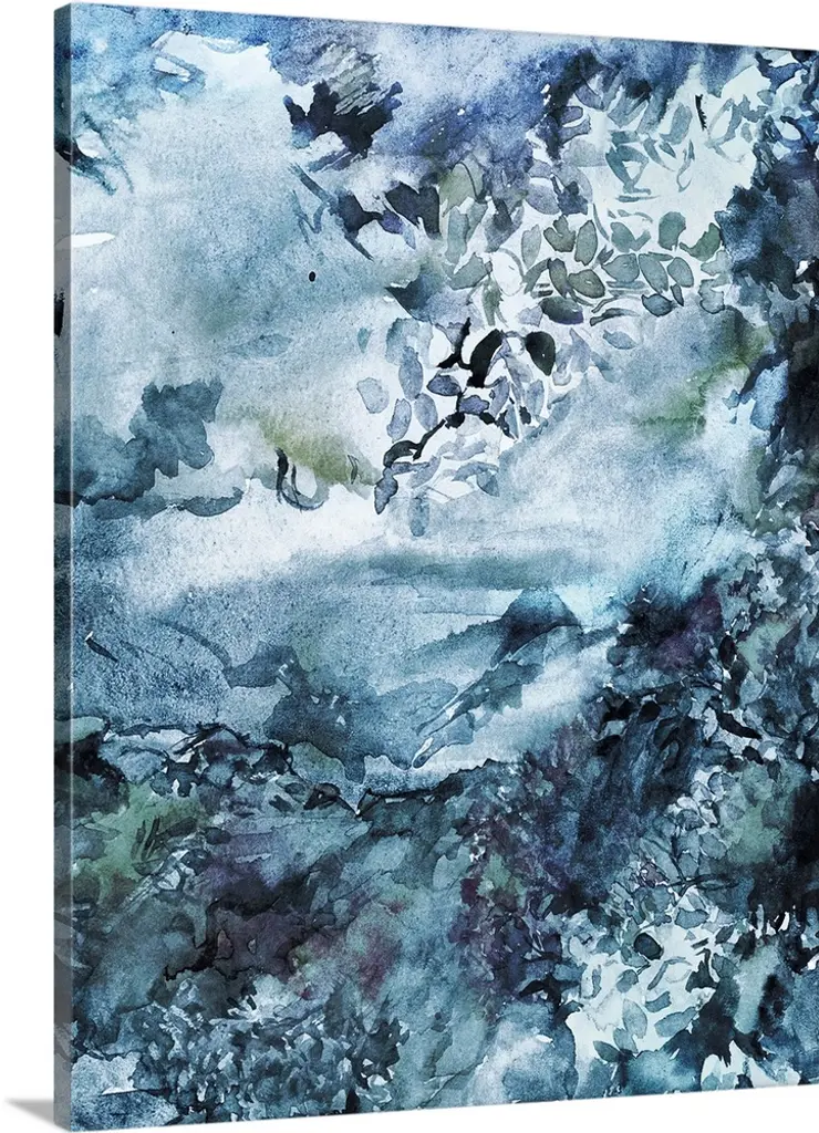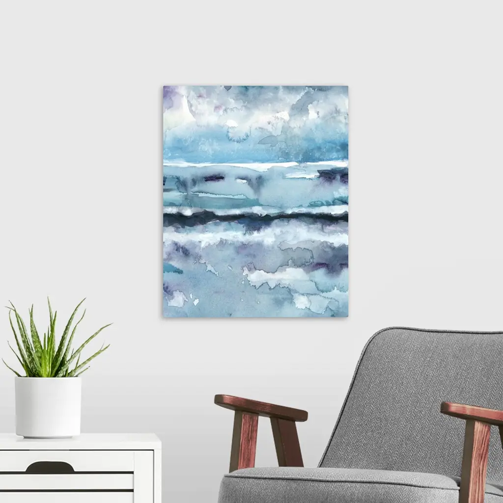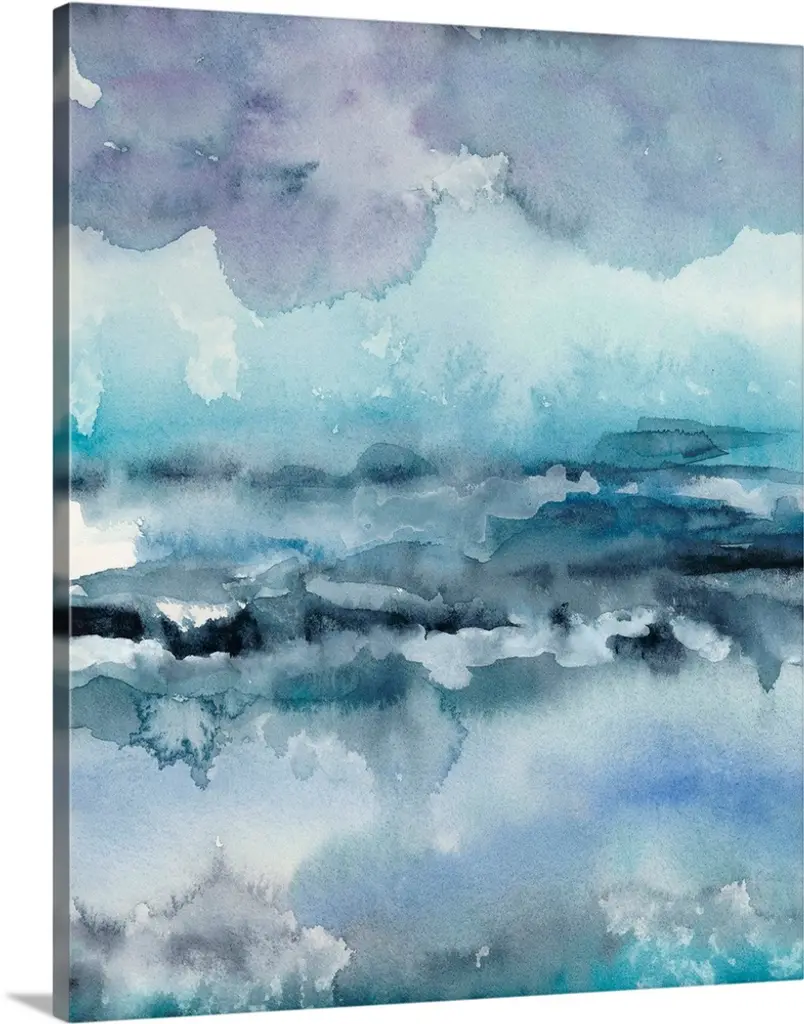 This vertical abstract watercolor painting contains shades of blue, purple and teal.