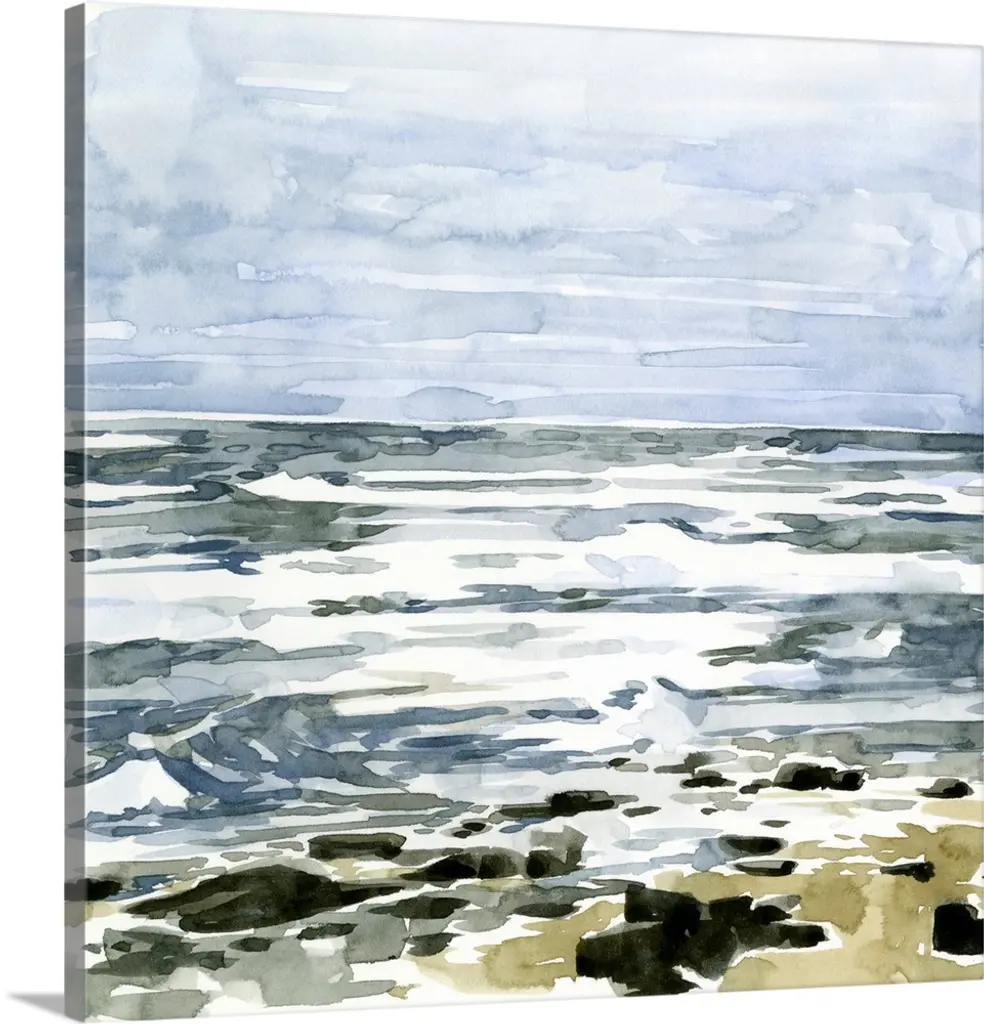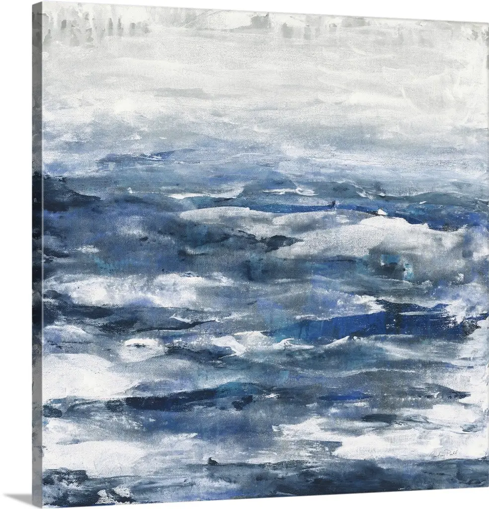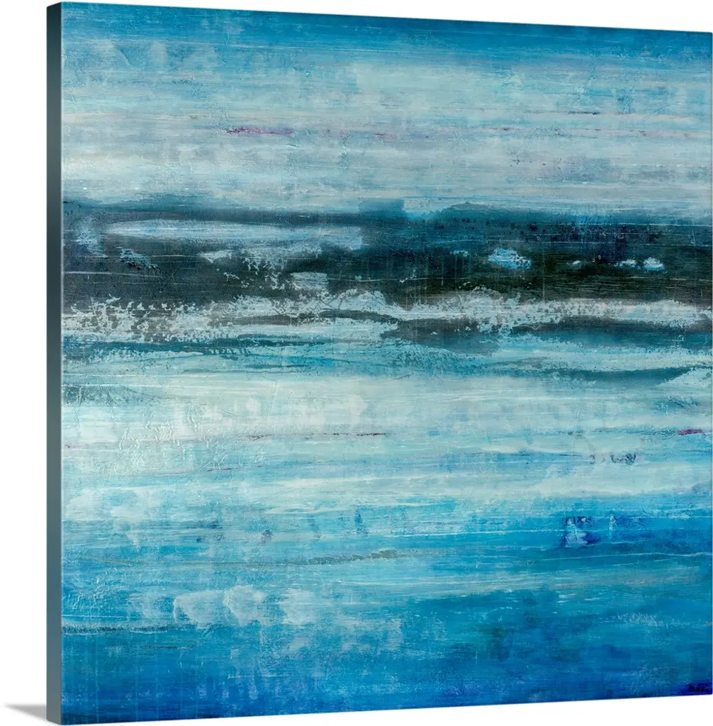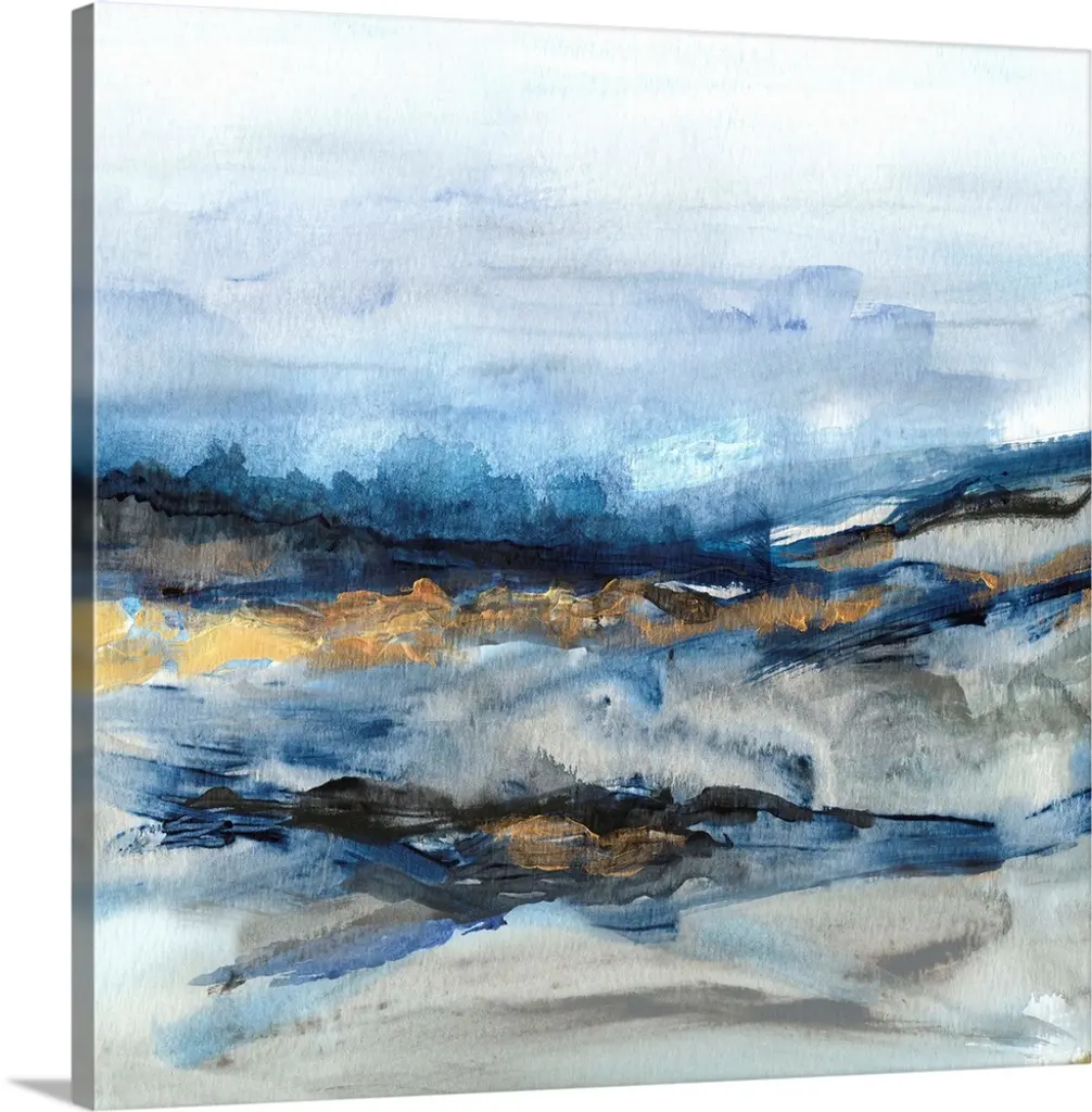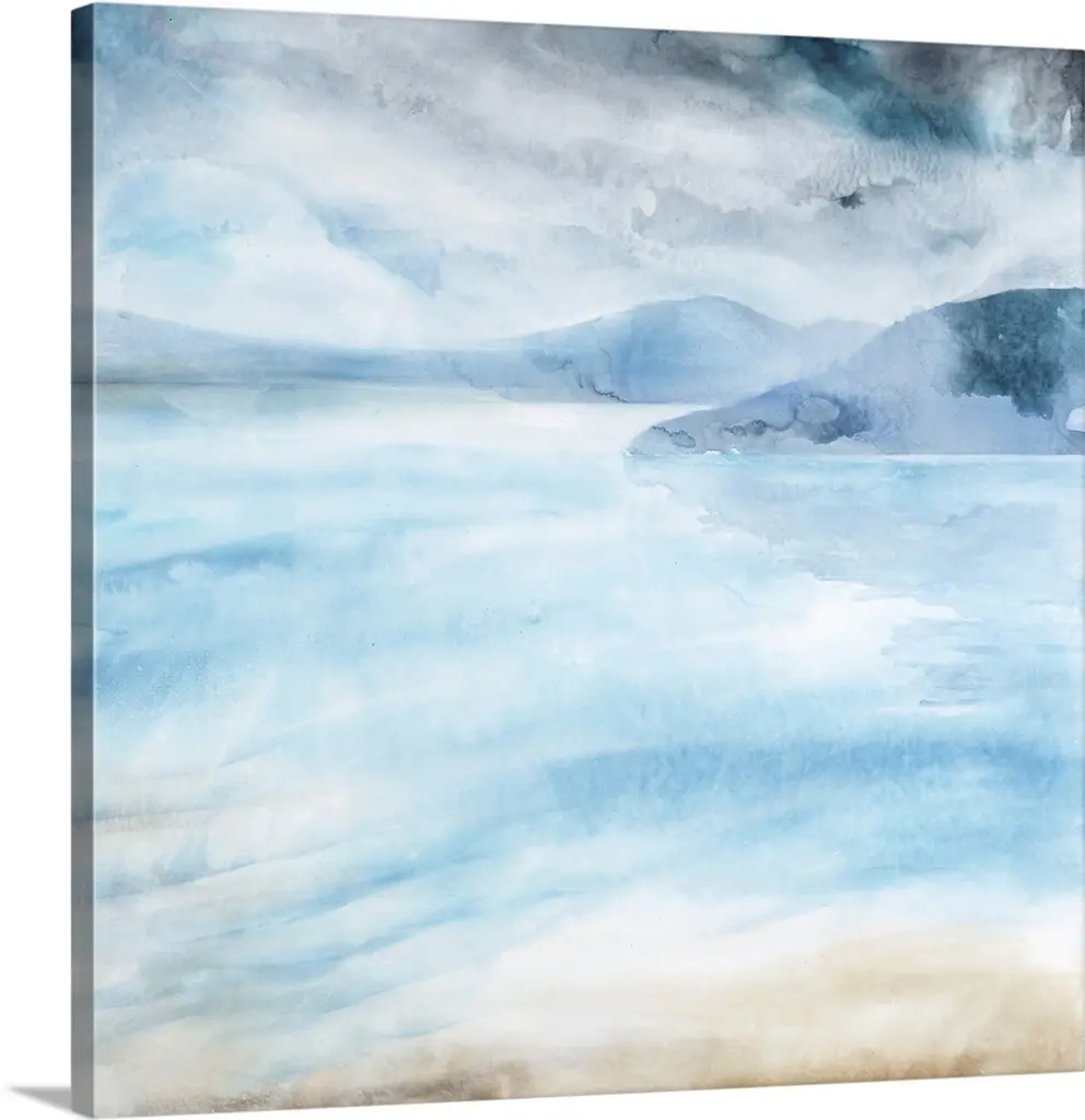 This vertical abstract watercolor painting contains shades of blue, purple and teal.