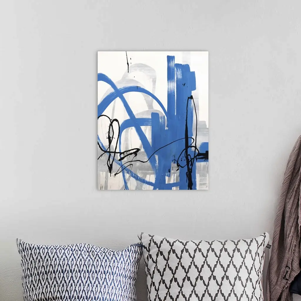 Contemporary abstract painting of a neutral background with blue and black exaggerated lines.