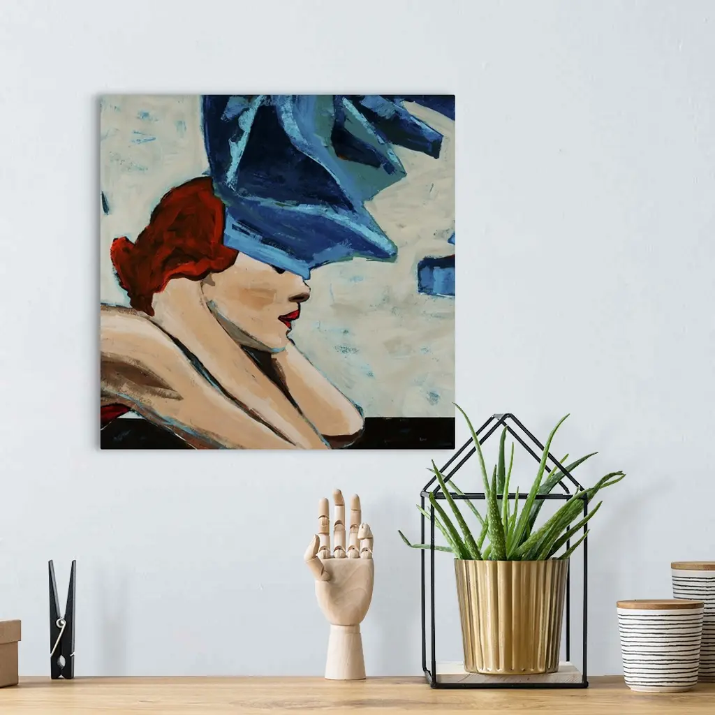 Contemporary painting of a woman's arms and head as she leans on her elbows, the top of her face partially covered by a large blue veil.