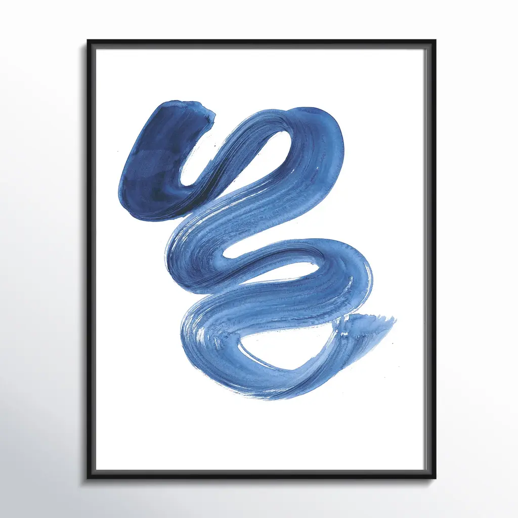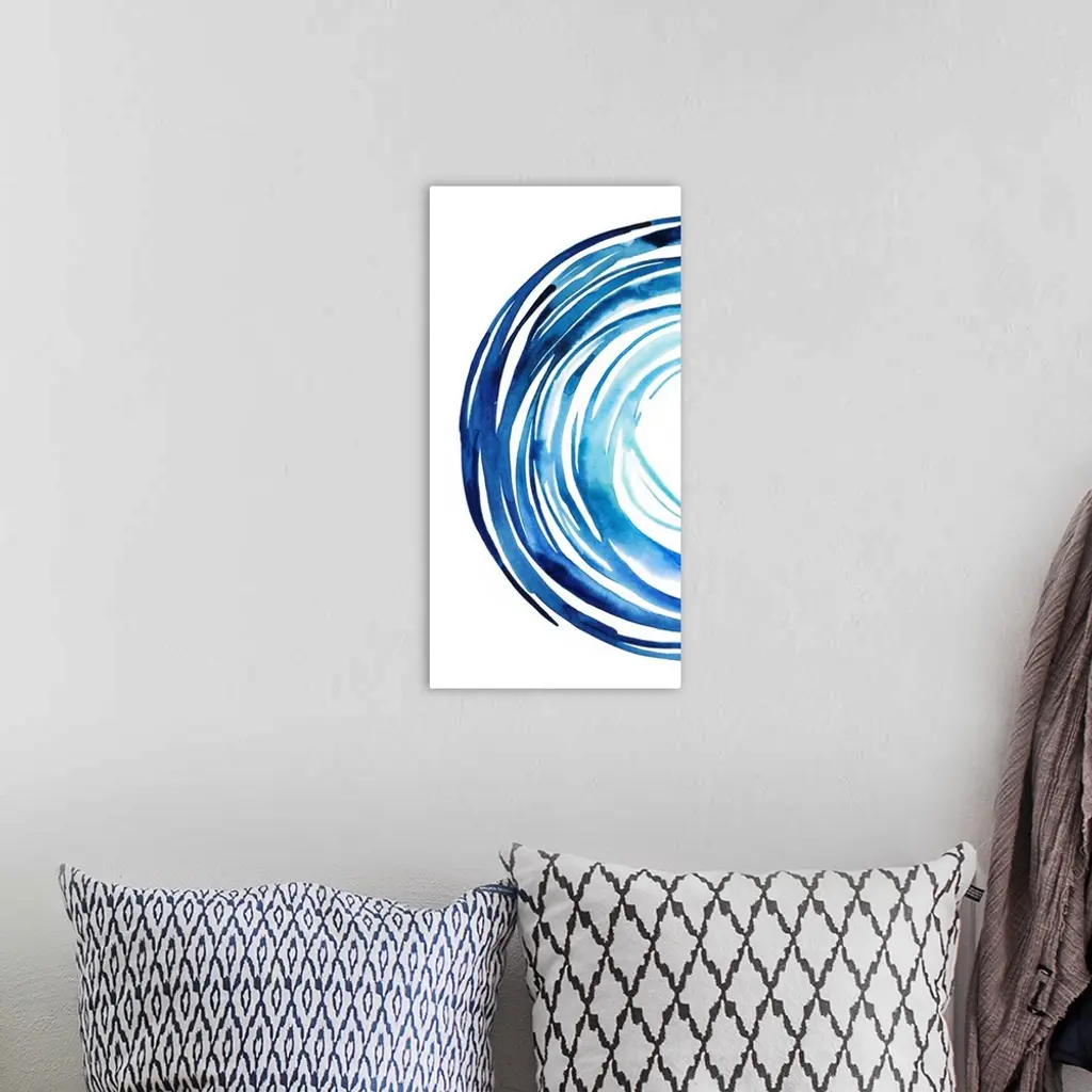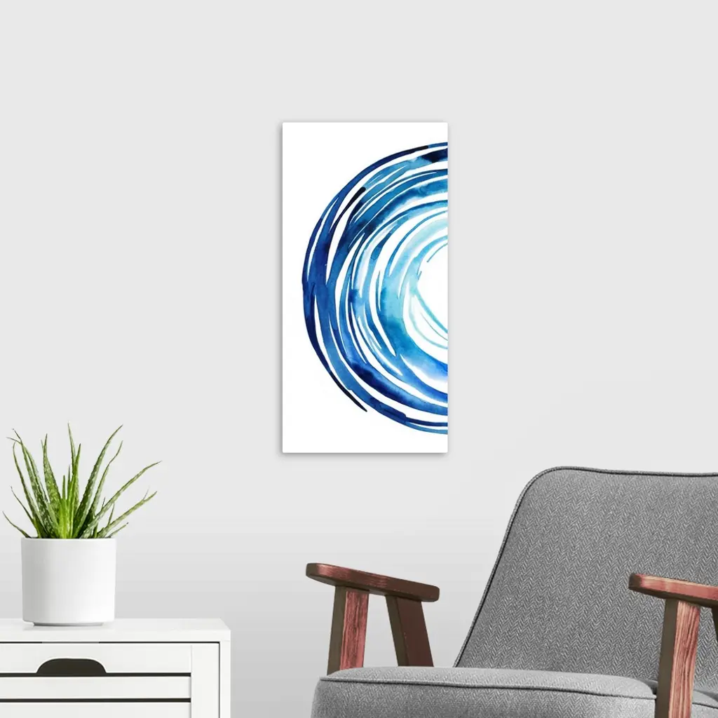 This contemporary artwork is part one of two that contains a half circle made up of blue gestural lines. When placed side by side, both parts join to make an illusion of a vortex.