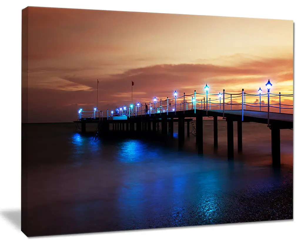 The Blue Waters and Bridge at Sunset canvas art print is sure to make an impression on anyone who sees it. This artwork is gallery wrapped around a 1-inch solid wood frame and arrives carefully packaged and entirely ready to hang on the wall. Design Art only uses the highest resolution and pigments to ensure a crisp colorful print that is never faded or pixelated. This artwork is sure to be a conversation starter in any home or office.