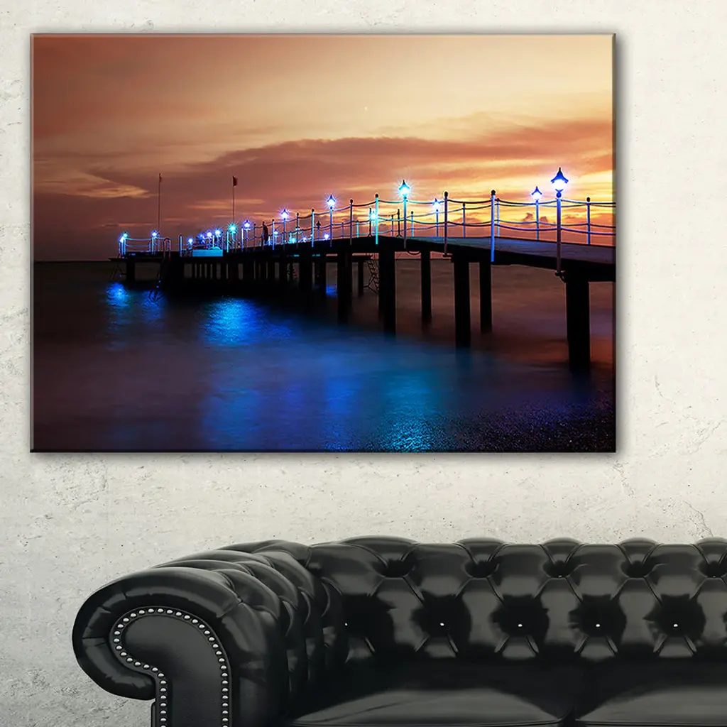 The Blue Waters and Bridge at Sunset canvas art print is sure to make an impression on anyone who sees it. This artwork is gallery wrapped around a 1-inch solid wood frame and arrives carefully packaged and entirely ready to hang on the wall. Design Art only uses the highest resolution and pigments to ensure a crisp colorful print that is never faded or pixelated. This artwork is sure to be a conversation starter in any home or office.