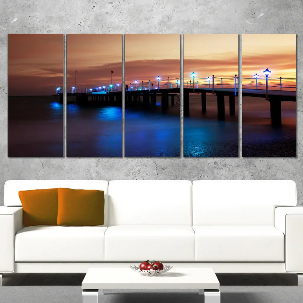 "Blue Waters And Bridge At Sunset" Sea Bridge Wall Artwork, 5 Panels, 60"x28"