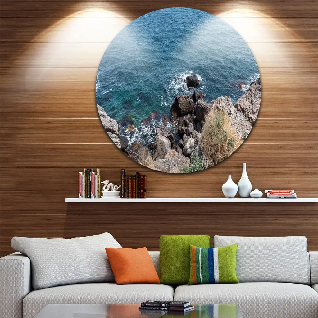 Bring Contemporary Abstraction to your home with this large Circle Metal wall art. This Blue Waters at Crimean Peninsula Beach Metal Artwork makes it the focal point of any room or office. - White Gloss Coating ensures colors are extra vibrant with light reflection.- Aluminum grade Sheet Metal with 1 inch mounting frame on the back giving the illusion that the artwork is floating on the wall..- Mounting Brackets are included along with instructions.- High Quality Digital images are created directly into a glossy aluminum panel producing a stunning and captivating print into the glossy finish of the metal.- Water, Fire and Scratch resistant HD Aluminum panels.- Looks better than any photo paper and guaranteed to last at least 20 years- Easy to clean with a microfiber cloth. Colors are far superior to regular Canvas Art. - Easy to Hang