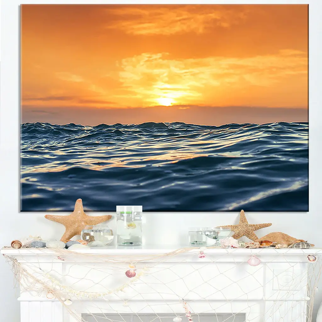 The Blue Waves Dancing at Yellow Sunset canvas art print is sure to make an impression on anyone who sees it. This artwork is gallery wrapped around a 1-inch solid wood frame and arrives carefully packaged and entirely ready to hang on the wall. Design Art only uses the highest resolution and pigments to ensure a crisp colorful print that is never faded or pixelated. This artwork is sure to be a conversation starter in any home or office.