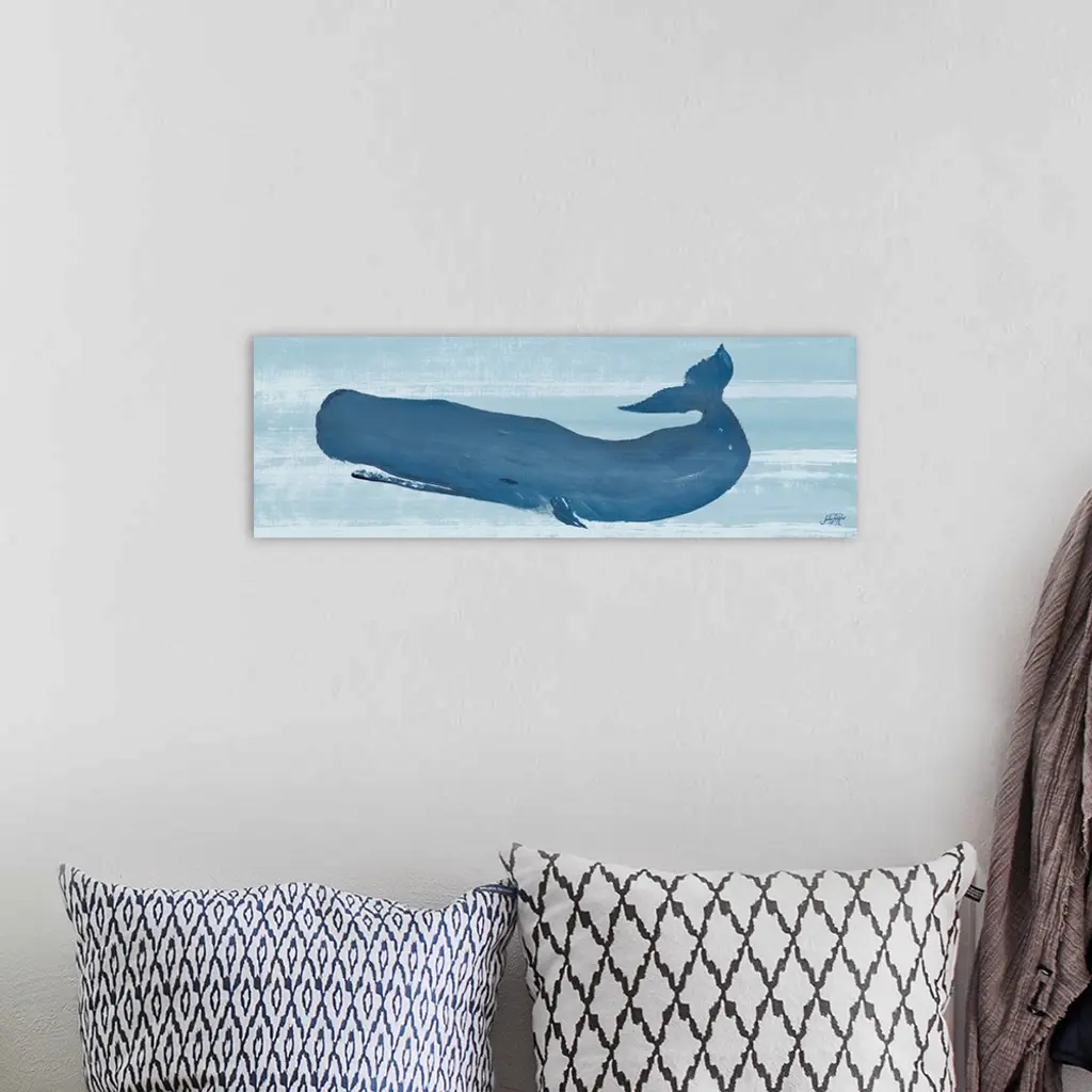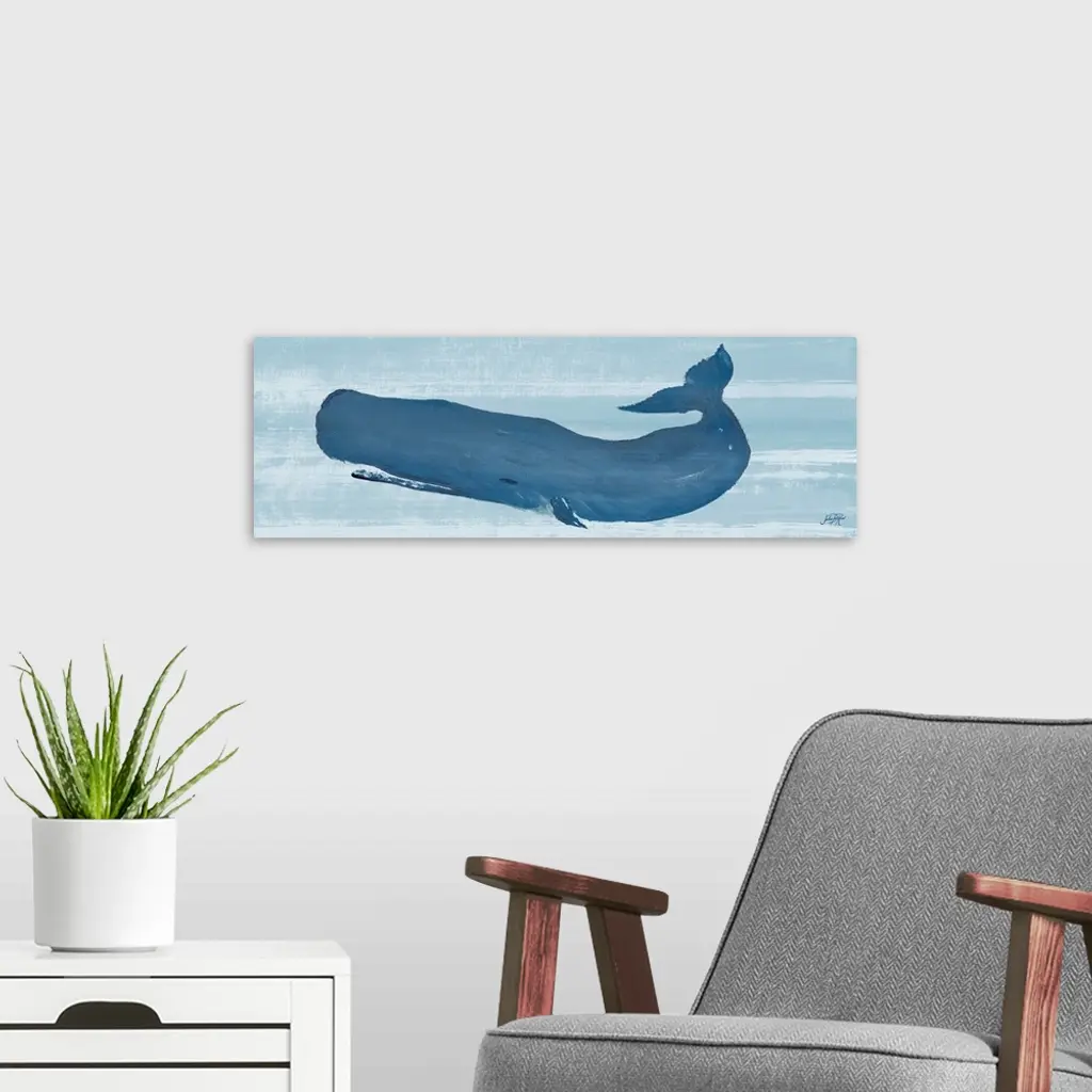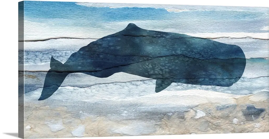 Painting of a large blue whale in the ocean.