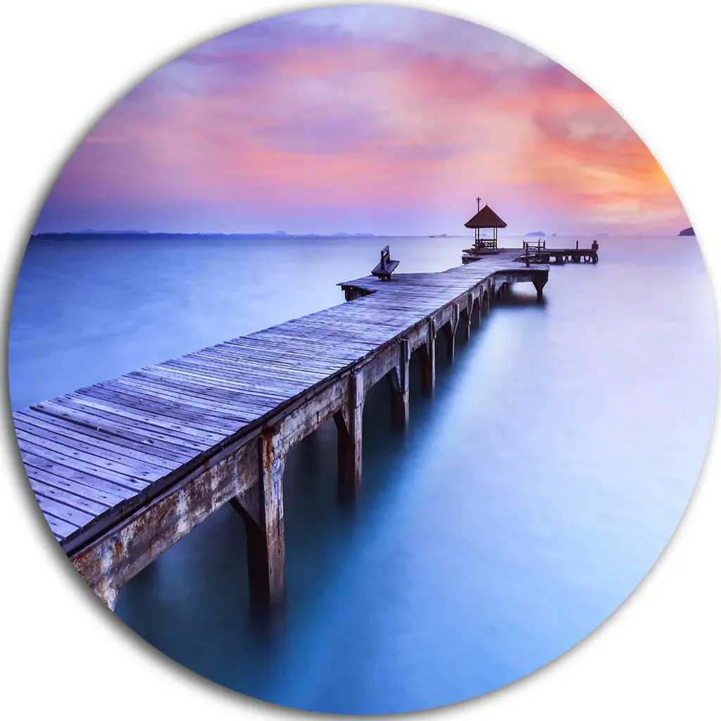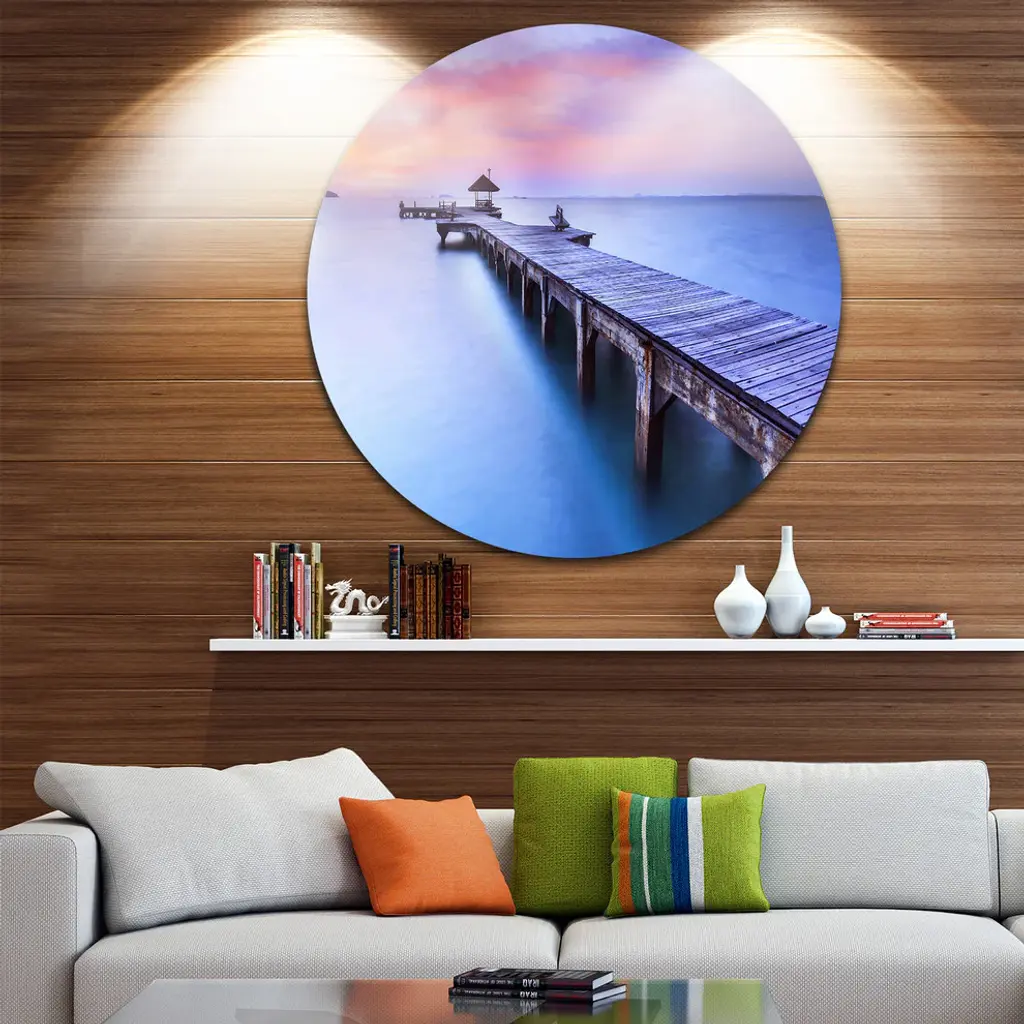 Bring Contemporary Abstraction to your home with this large Circle Metal wall art. This Blue Wooden Bridge Metal Artwork makes it the focal point of any room or office. - White Gloss Coating ensures colors are extra vibrant with light reflection.- Aluminum grade Sheet Metal with 1 inch mounting frame on the back giving the illusion that the artwork is floating on the wall..- Mounting Brackets are included along with instructions.- High Quality Digital images are created directly into a glossy aluminum panel producing a stunning and captivating print into the glossy finish of the metal.- Water, Fire and Scratch resistant HD Aluminum panels.- Looks better than any photo paper and guaranteed to last at least 20 years- Easy to clean with a microfiber cloth. Colors are far superior to regular Canvas Art. - Easy to Hang