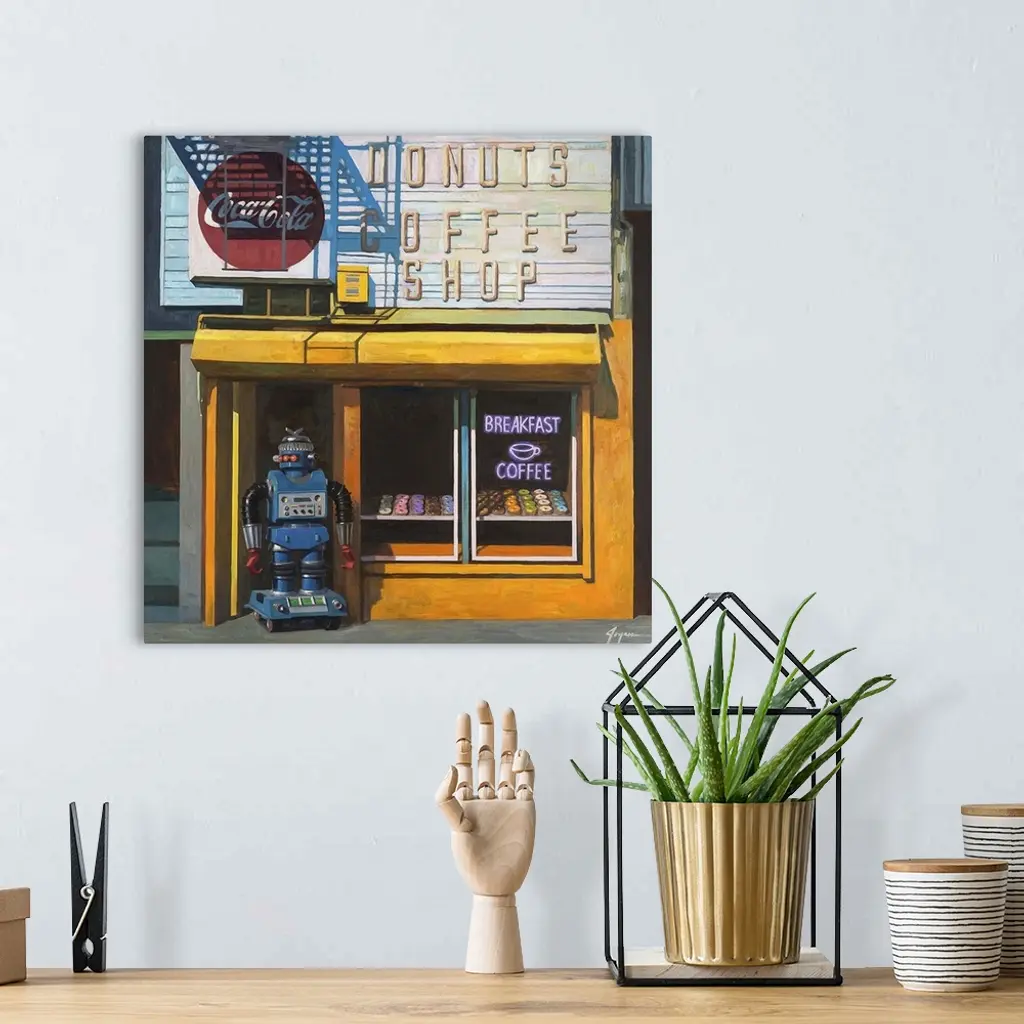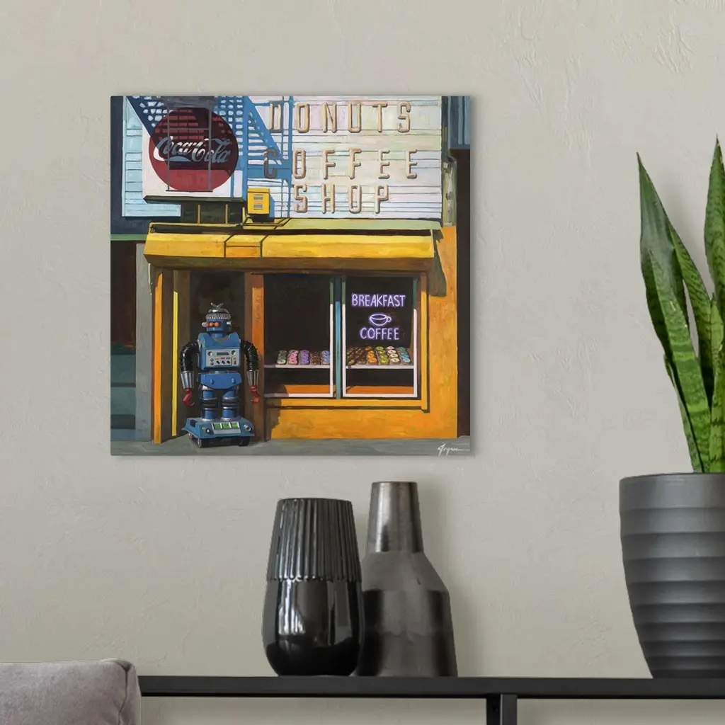 A contemporary painting of a blue retro toy robot standing out front of a donut shop waiting for customers.
