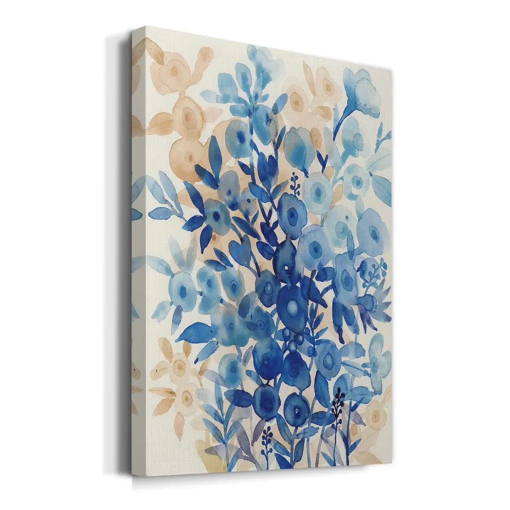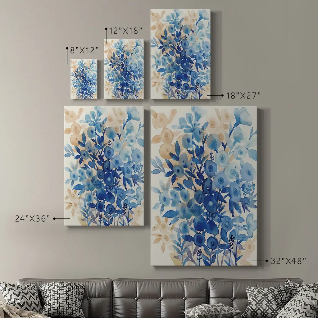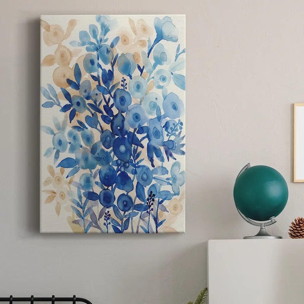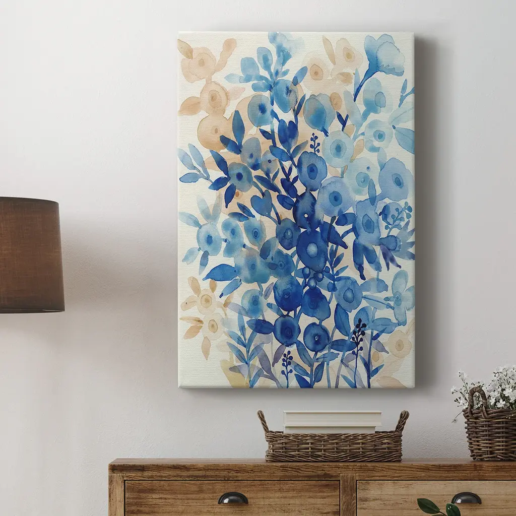 Blueberry Floral II Premium Gallery Wrapped Canvas - Ready to Hang A premium hand stretched gallery wrapped canvas print created to last. Featuring a beveled a solid wood stretcher bar, each piece comes ready to hand 6 SIZES AVAILABLE 8''X12'' - Overall Size 12''X18'' - Overall Size 18''X27'' - Overall Size 24''x36'' - Overall Size 32''x48'' - Overall Size 40''x60'' - Overall Size Each piece is made to order. Built to Last Each piece comes ready to hang Solid wood stretcher Fade and Water resistant Made domestically