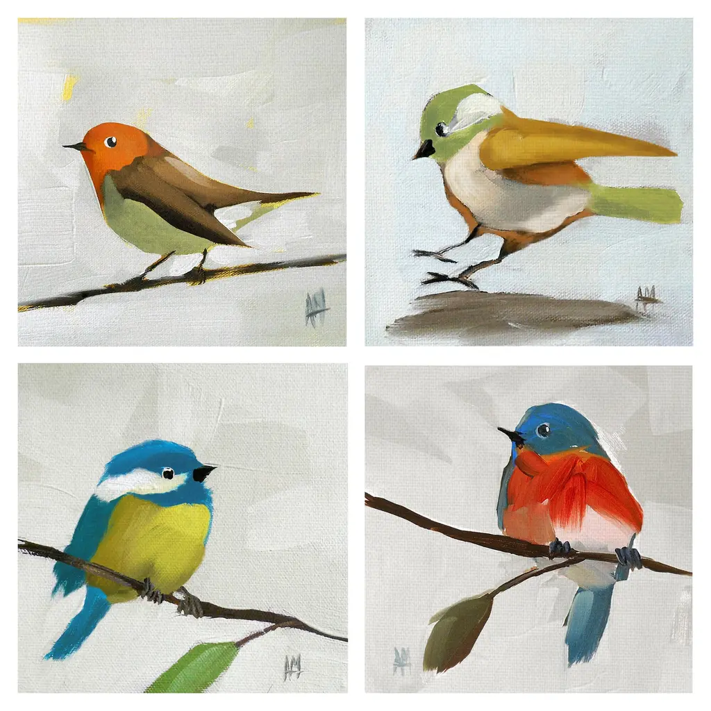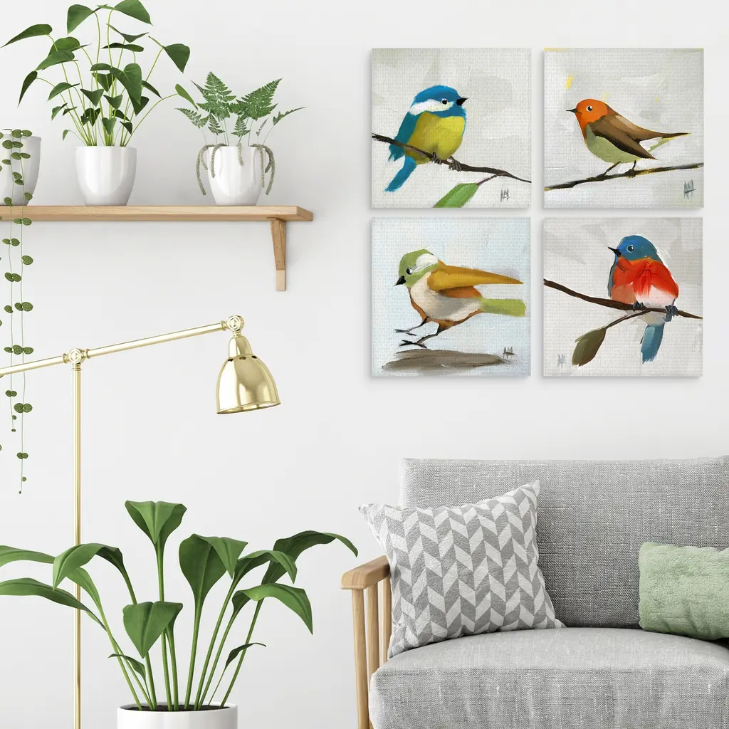 Bluebird No. 21, Chickadee No. 143, Coming In For A Landing, Robin On A Wire By Angela Moulton Canvas Art Prints - 16x16x2