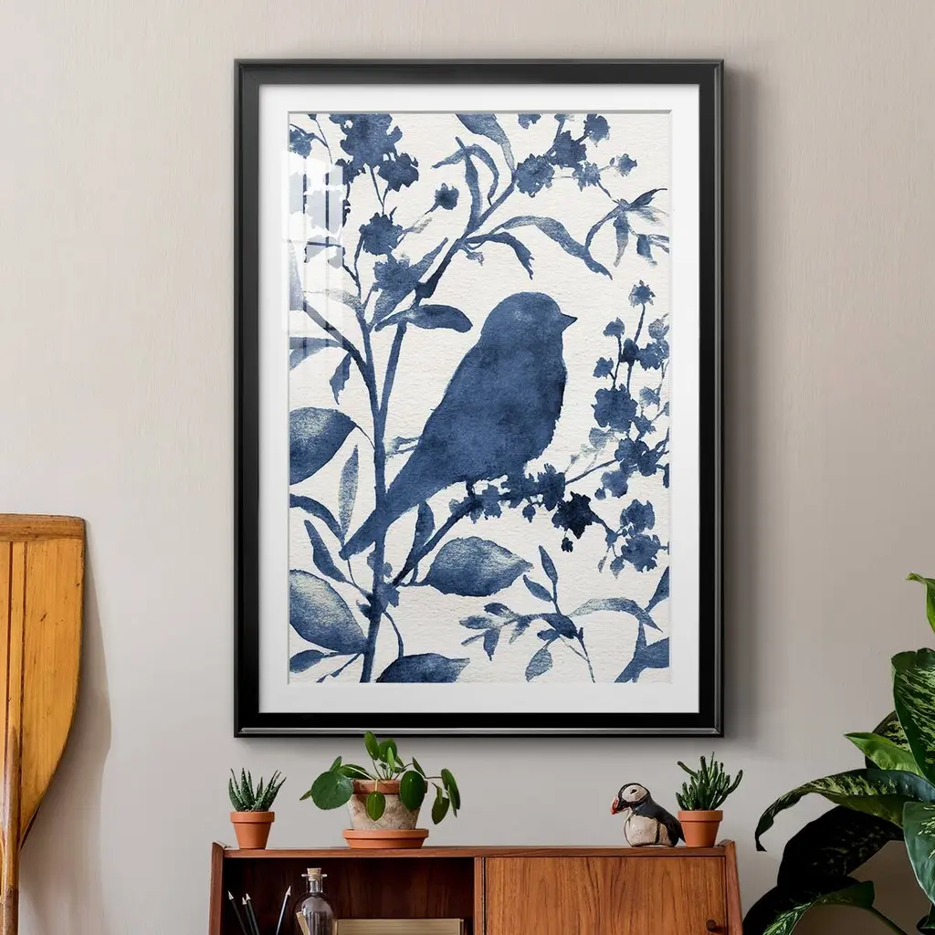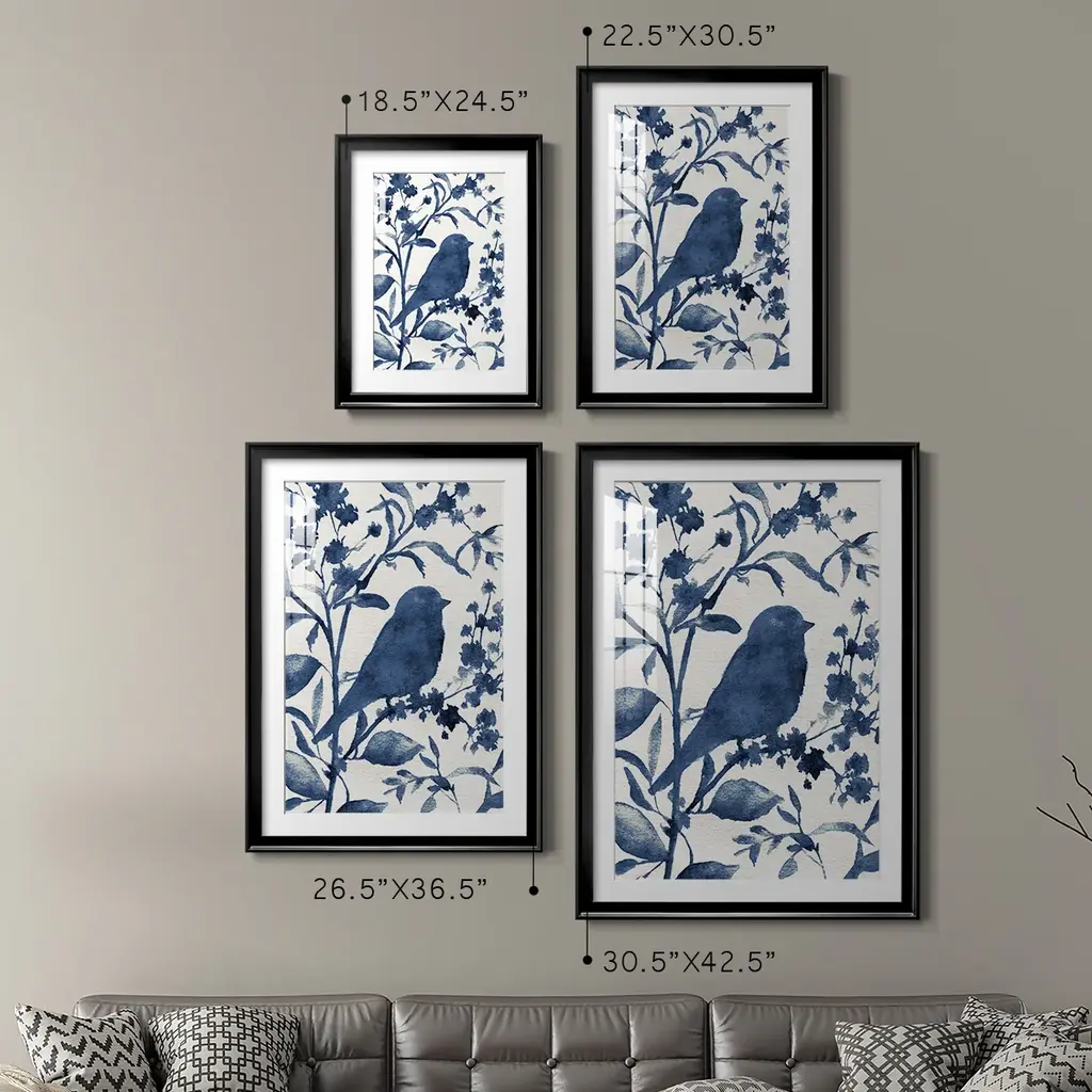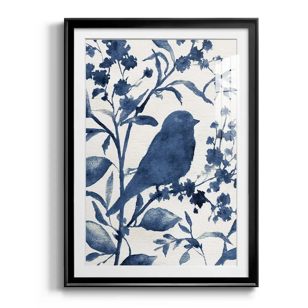Bluebird Silhouette I Premium Framed Print - Ready to Hang A Premium Framed Print created to last. Framed in distressed wood and available in an array of sizes and colors Featuring a beveled a solid wood stretcher bar, each piece comes ready to hand 4 SIZES AVAILABLE 30.5''X42.5'' - Overall Size 26.5'X36.5'' - Overall Size 22.5''x30.5'' - Overall Size 18.5''x24.5'' - Overall Size Each piece is made to order. Each piece comes with hanging hardware. Made in the USA Ready to Hang Giclee Paper Print Acrylic Glass Beveled Matt Board