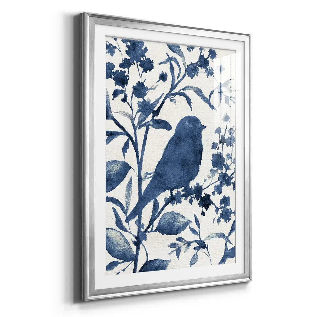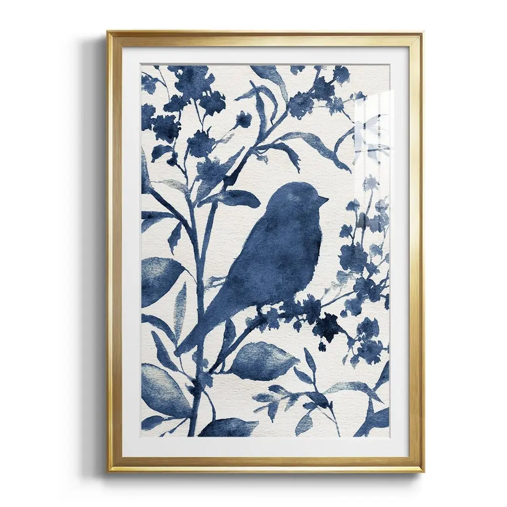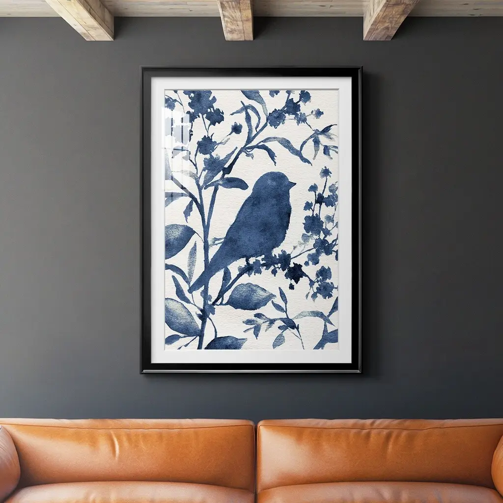 Bluebird Silhouette I Premium Framed Print - Ready to Hang A Premium Framed Print created to last. Framed in distressed wood and available in an array of sizes and colors Featuring a beveled a solid wood stretcher bar, each piece comes ready to hand 4 SIZES AVAILABLE 30.5''X42.5'' - Overall Size 26.5'X36.5'' - Overall Size 22.5''x30.5'' - Overall Size 18.5''x24.5'' - Overall Size Each piece is made to order. Each piece comes with hanging hardware. Made in the USA Ready to Hang Giclee Paper Print Acrylic Glass Beveled Matt Board