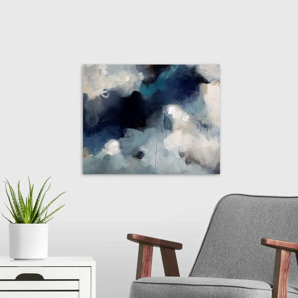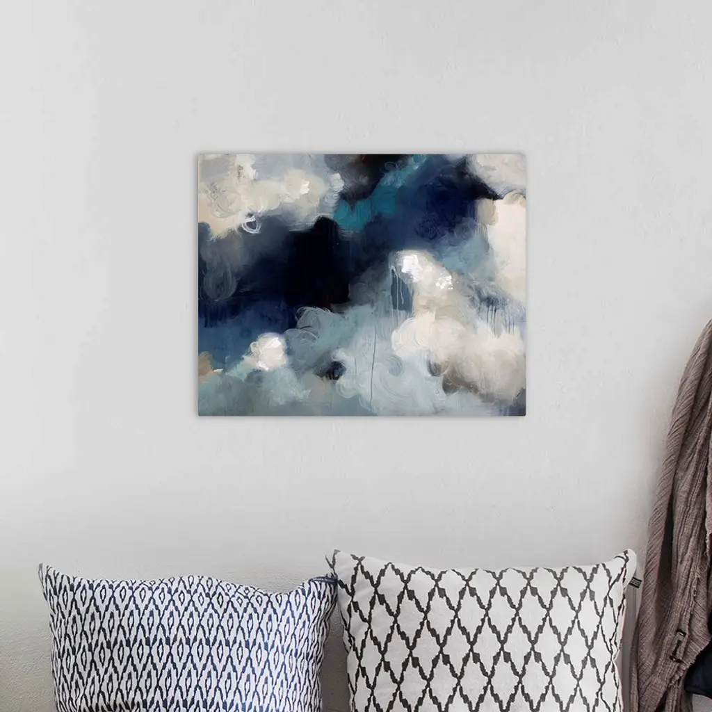 Abstract painting of what almost looks like fluffy white clouds in an aggressive dark sky.