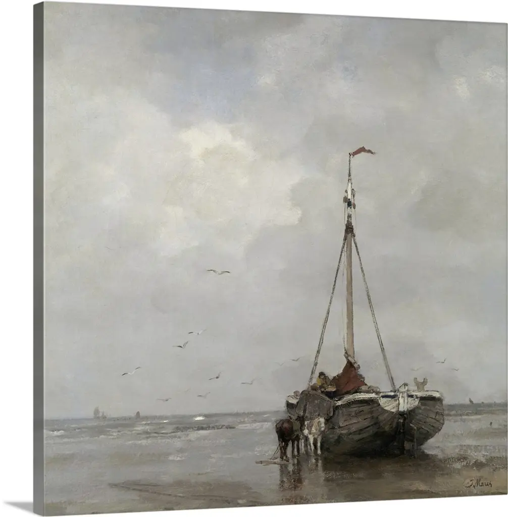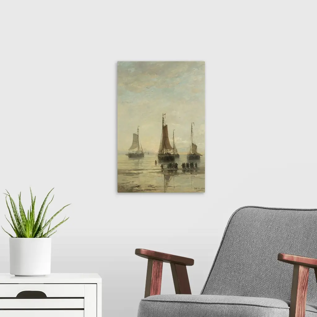 Bluff-Bowed Scheveningen Boats at Anchor, by Hendrik Willem Mesdag, 1860-89, Dutch oil painting on canvas. Fishing boats anchored near the beach, where a group of fishwives are gathered.
