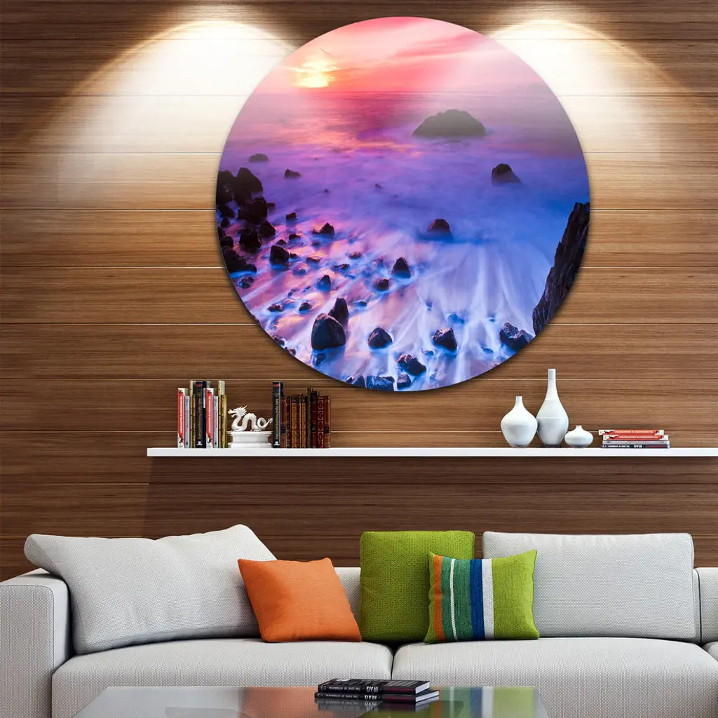 Bring Contemporary Abstraction to your home with this large Circle Metal wall art. This Bluish Waters at Sunset Panorama Metal Artwork makes it the focal point of any room or office. - White Gloss Coating ensures colors are extra vibrant with light reflection.- Aluminum grade Sheet Metal with 1 inch mounting frame on the back giving the illusion that the artwork is floating on the wall..- Mounting Brackets are included along with instructions.- High Quality Digital images are created directly into a glossy aluminum panel producing a stunning and captivating print into the glossy finish of the metal.- Water, Fire and Scratch resistant HD Aluminum panels.- Looks better than any photo paper and guaranteed to last at least 20 years- Easy to clean with a microfiber cloth. Colors are far superior to regular Canvas Art. - Easy to Hang
