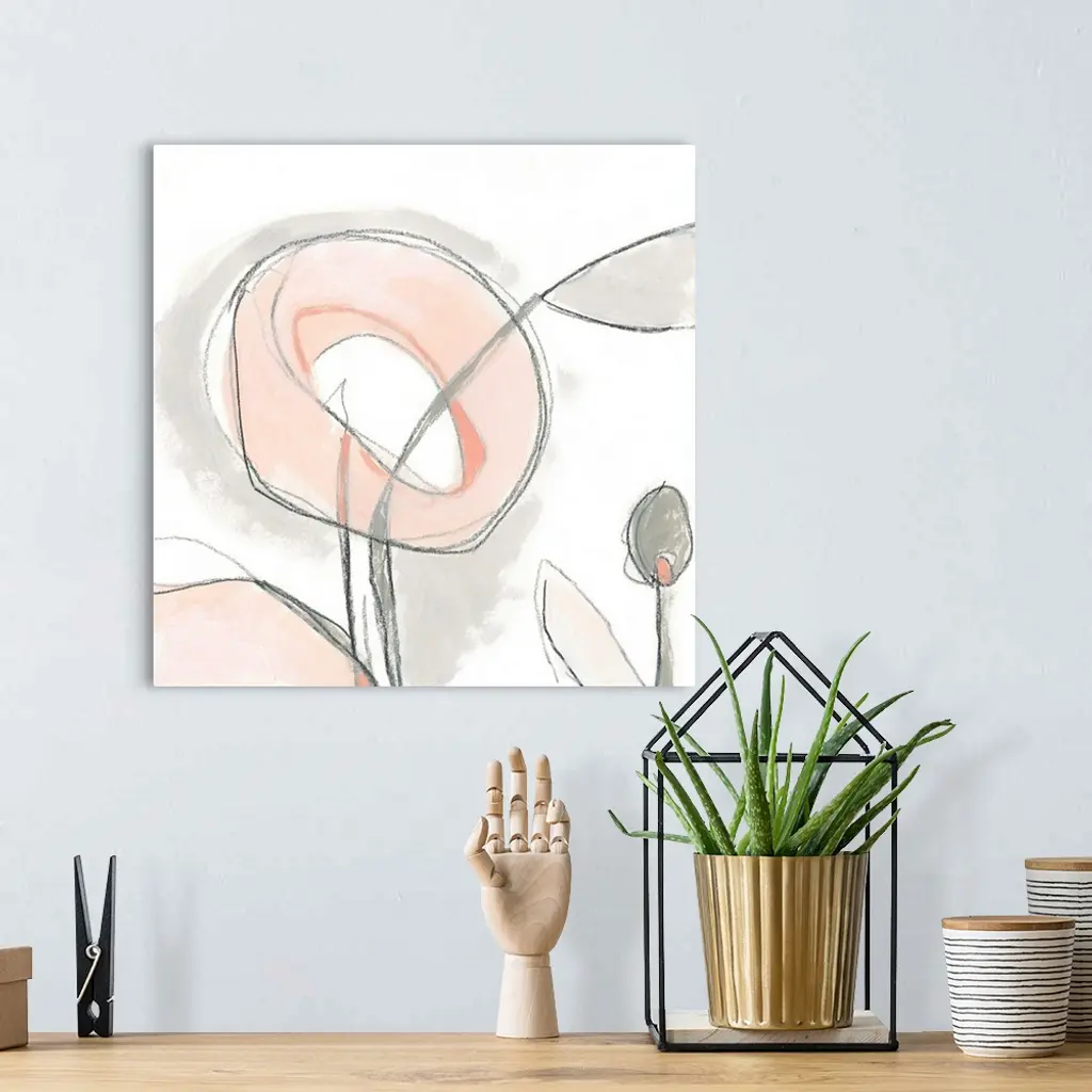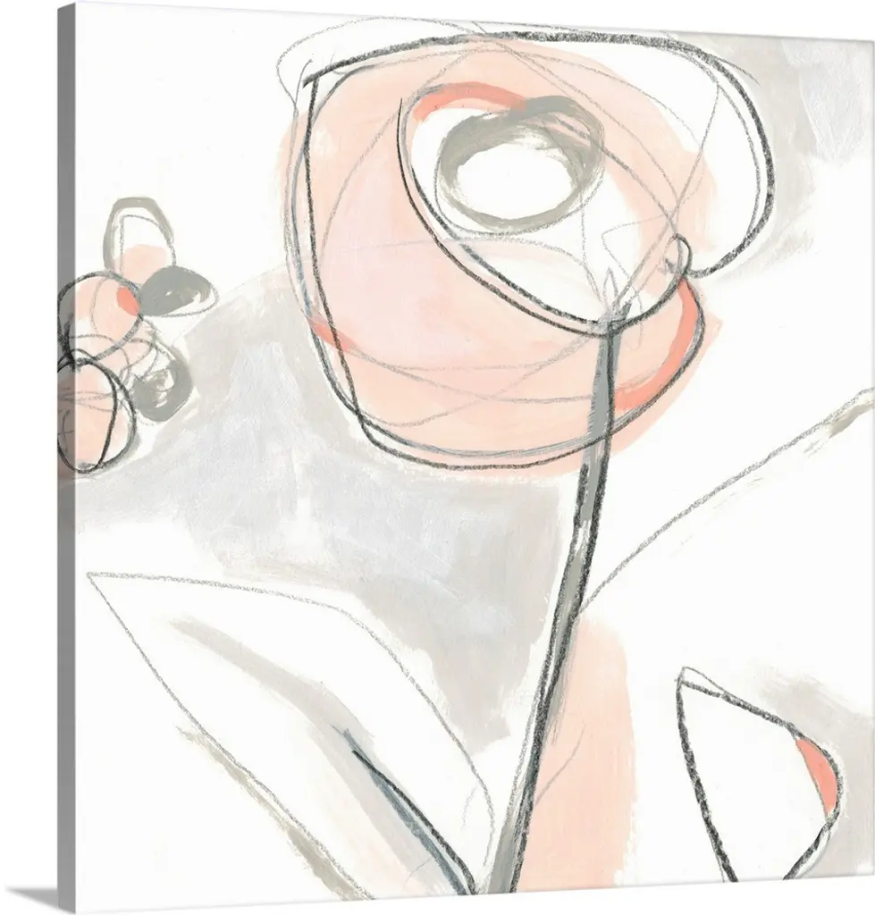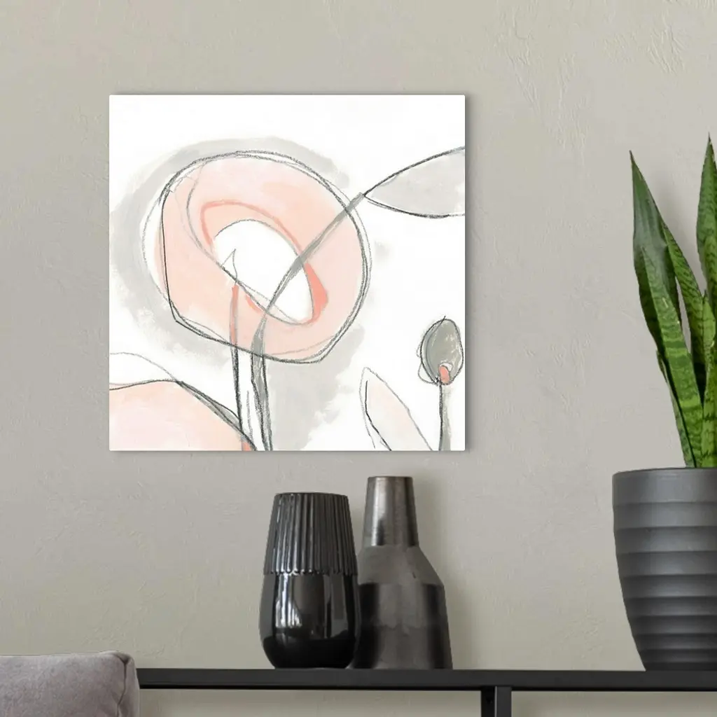 A contemporary abstract painting in organic shapes, reminiscent of a circular pink flower with grey leaves