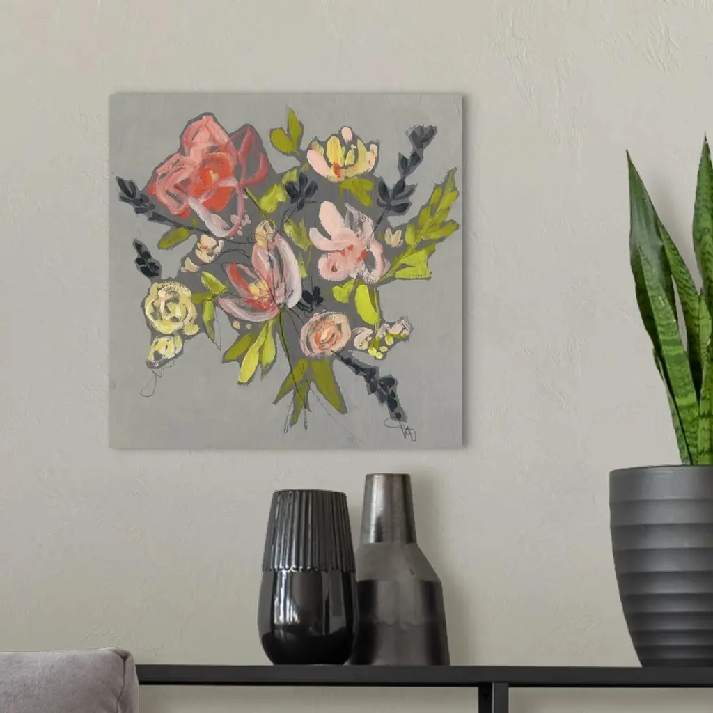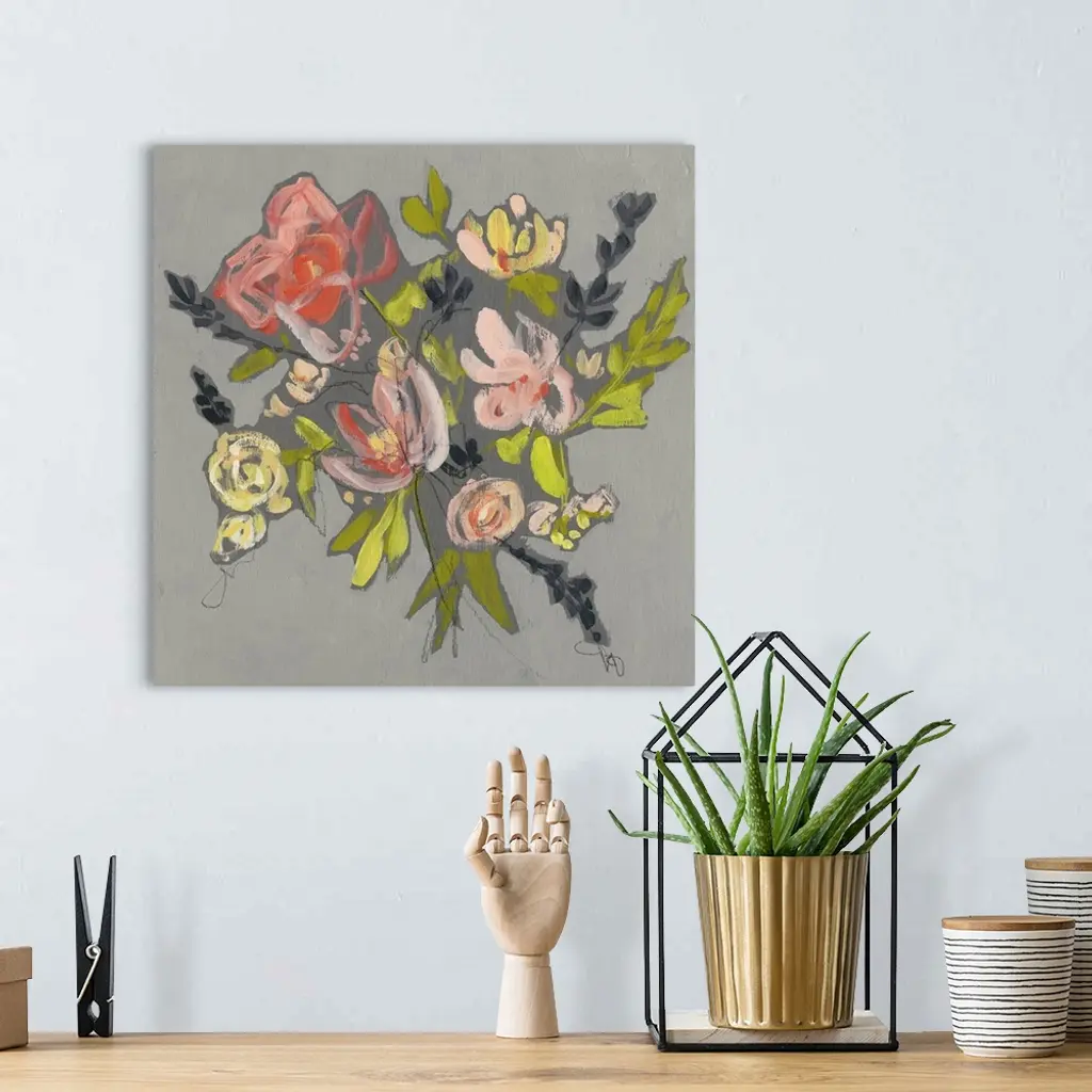 This contemporary artwork consists of whimsical and romantic bouquet of flowers with bright green leaves over a gray background.