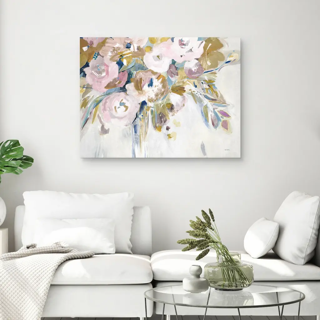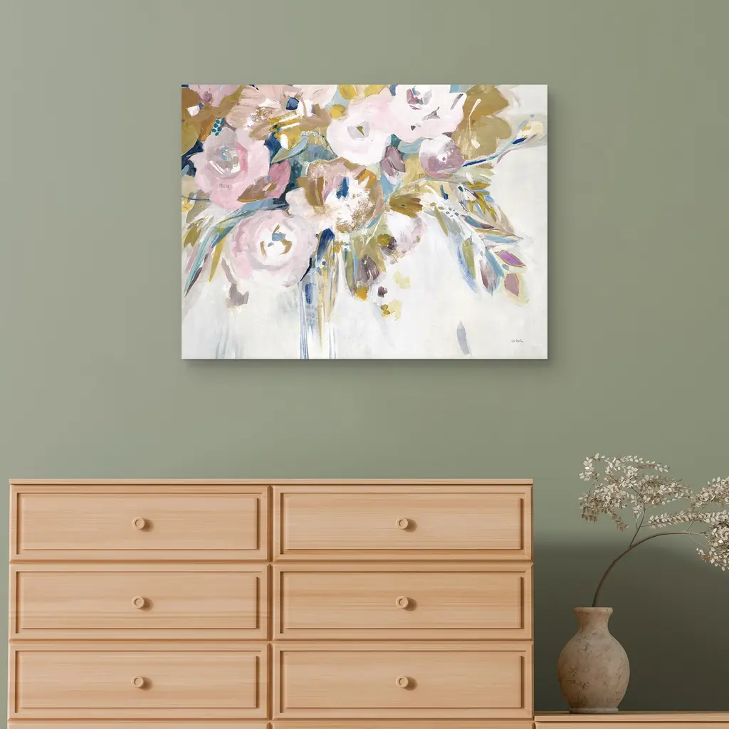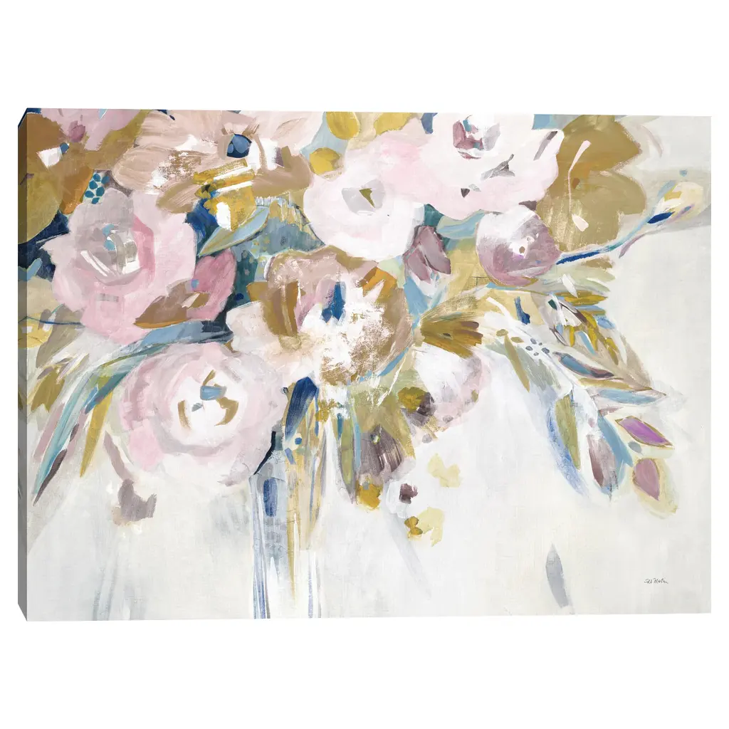 The glazed and short brushstrokes are what make this print gauzy and airy. Blush Bouquet I, a canvas art print, by Jill Martin is a still life piece that is so refined in texture and color, that this gossamer floral arrangement appears to be fading before our eyes. This beautiful piece of wall decor would make a wonderful wedding or house warming present.
