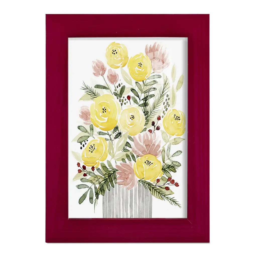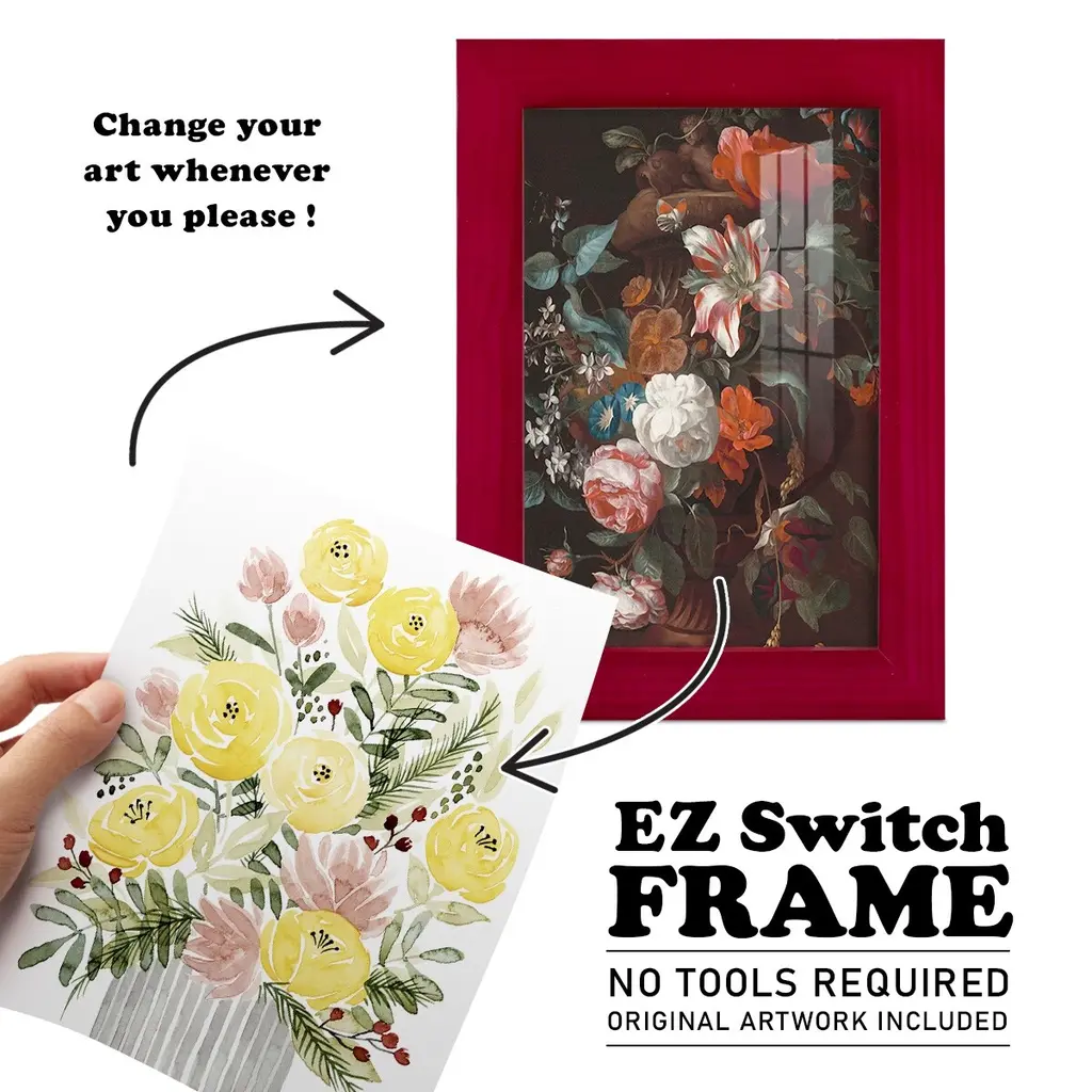 Blush Bouquet I -EZ SWITCH Framed Print w/glass-Cherry Red A delightful, framed print. Featuring a solid wood frame with real wood glass. This premium print is giclee quality. In addition, every frame features a removable back and table top stand. This allows you to change your art in the future or to just stand the art on a table for a new look. We are sure you'll enjoy our new series of EZ SWITCH Framed Art. Solid Wood Frame Real Glass Removable / Replaceable Art Built in Tabletop Stand Sizes range from 4x6 up to 12x15 - buy just one or pair them up as sets as you see fit.