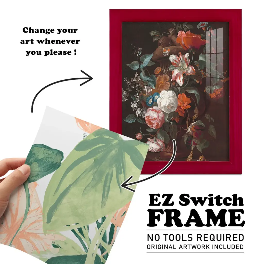 Blush Breeze II -EZ SWITCH Framed Print w/glass-Cherry Red A delightful, framed print. Featuring a solid wood frame with real wood glass. This premium print is giclee quality. In addition, every frame features a removable back and table top stand. This allows you to change your art in the future or to just stand the art on a table for a new look. We are sure you'll enjoy our new series of EZ SWITCH Framed Art. Solid Wood Frame Real Glass Removable / Replaceable Art Built in Tabletop Stand Sizes range from 4x6 up to 12x15 - buy just one or pair them up as sets as you see fit.