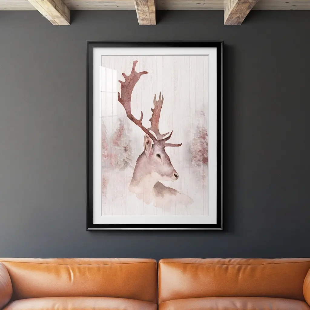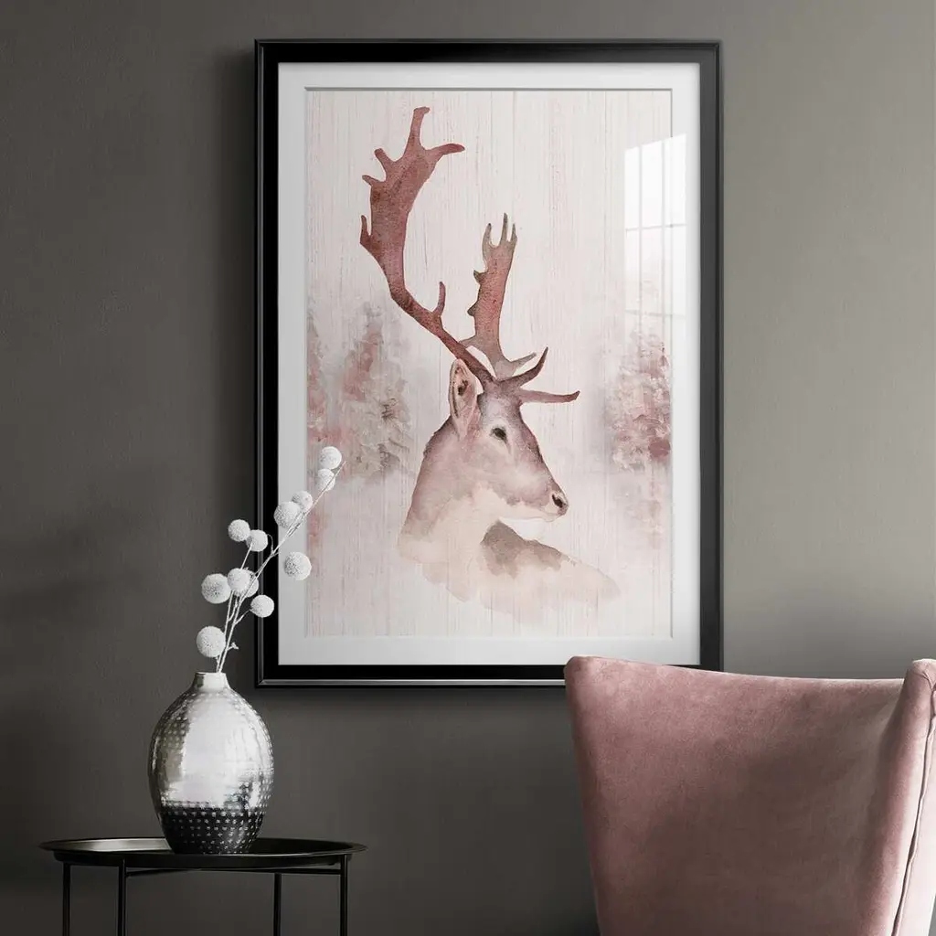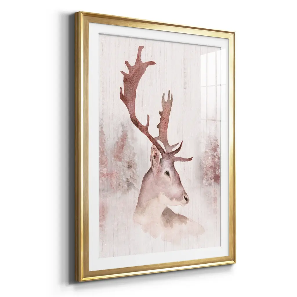 Blush Deer Premium Framed Print - Ready to Hang A Premium Framed Print created to last. Framed in distressed wood and available in an array of sizes and colors Featuring a beveled a solid wood stretcher bar, each piece comes ready to hand 4 SIZES AVAILABLE 30.5''X42.5'' - Overall Size 26.5'X36.5'' - Overall Size 22.5''x30.5'' - Overall Size 18.5''x24.5'' - Overall Size Each piece is made to order. Each piece comes with hanging hardware. Made in the USA Ready to Hang Giclee Paper Print Acrylic Glass Beveled Matt Board