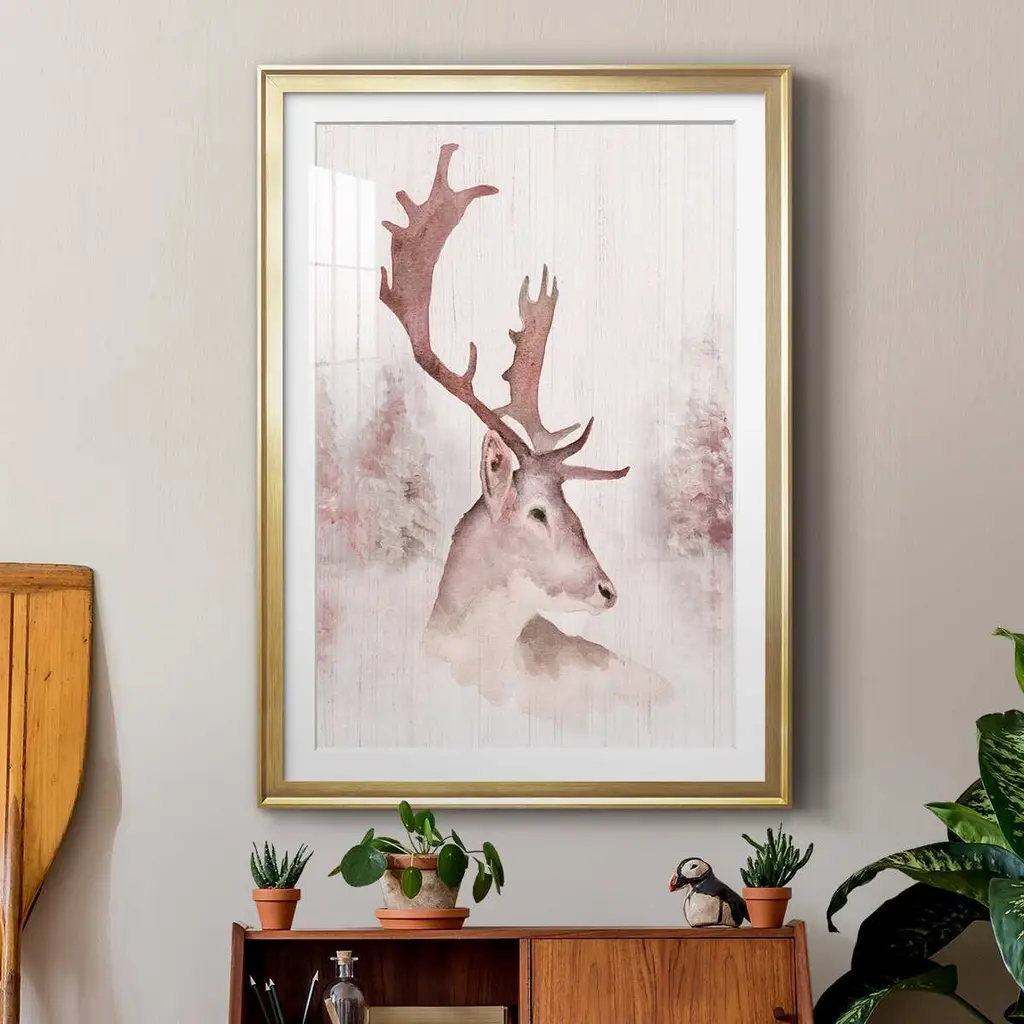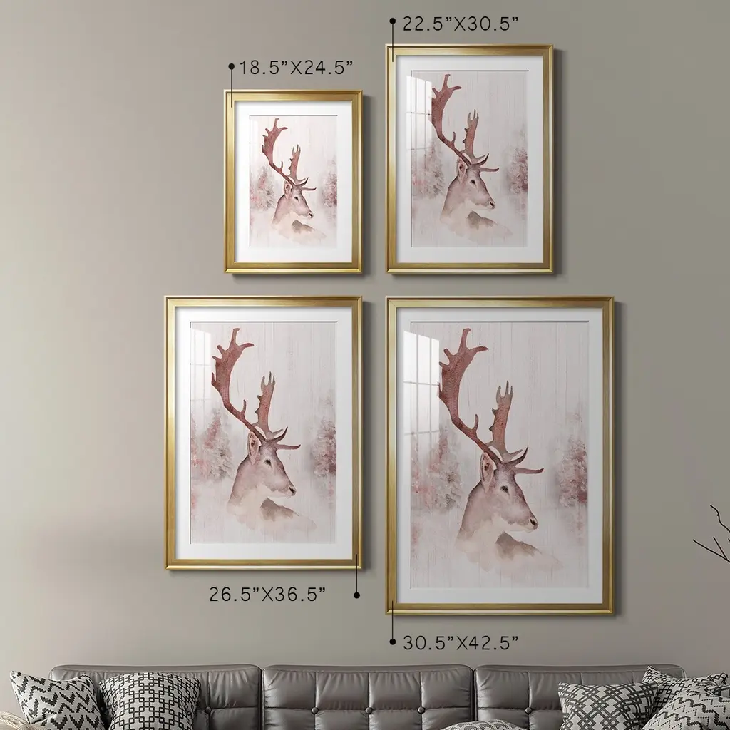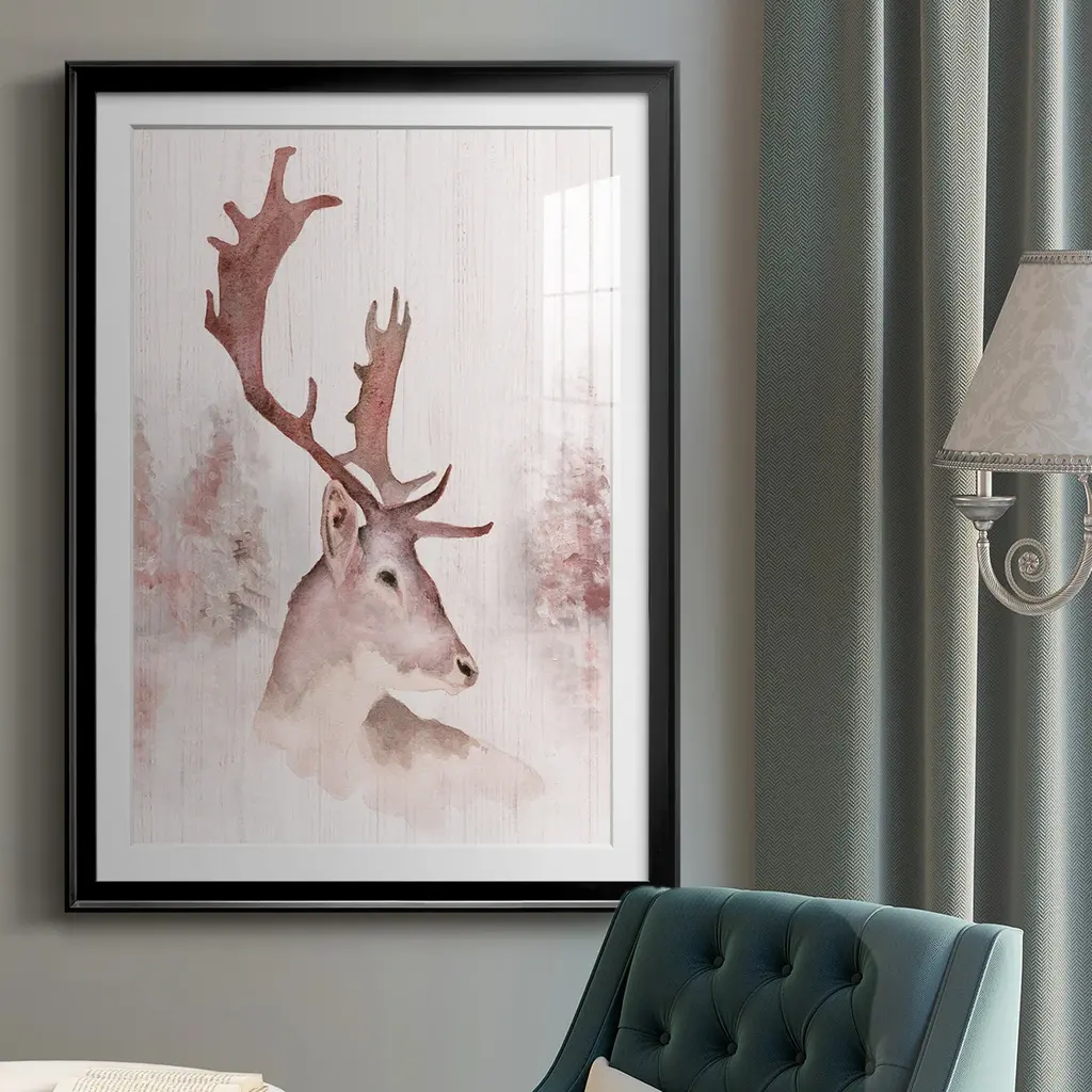 Blush Deer Premium Framed Print - Ready to Hang A Premium Framed Print created to last. Framed in distressed wood and available in an array of sizes and colors Featuring a beveled a solid wood stretcher bar, each piece comes ready to hand 4 SIZES AVAILABLE 30.5''X42.5'' - Overall Size 26.5'X36.5'' - Overall Size 22.5''x30.5'' - Overall Size 18.5''x24.5'' - Overall Size Each piece is made to order. Each piece comes with hanging hardware. Made in the USA Ready to Hang Giclee Paper Print Acrylic Glass Beveled Matt Board