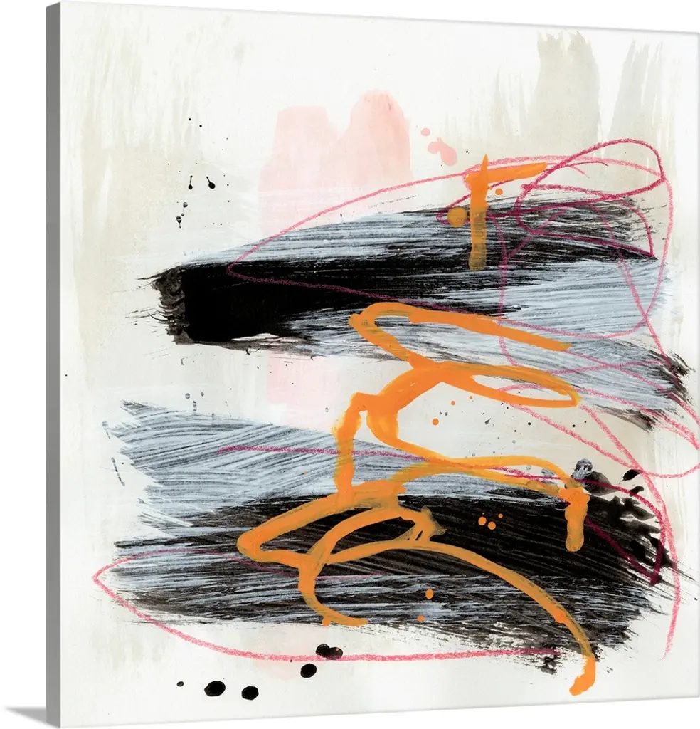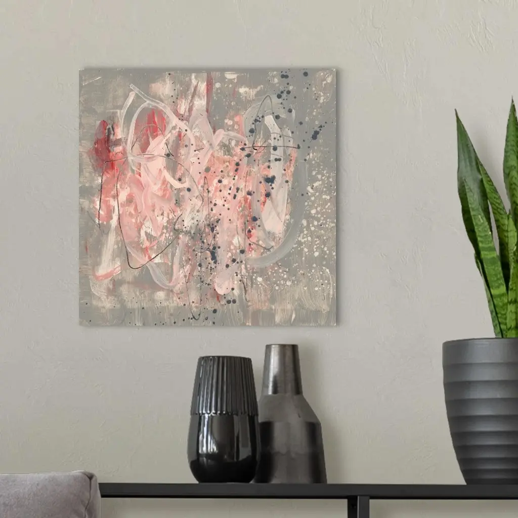 Untamed brush strokes in shades of pink overlap blocks of gray color adorned with splatters and gestural mark making lines in this abstract artwork.