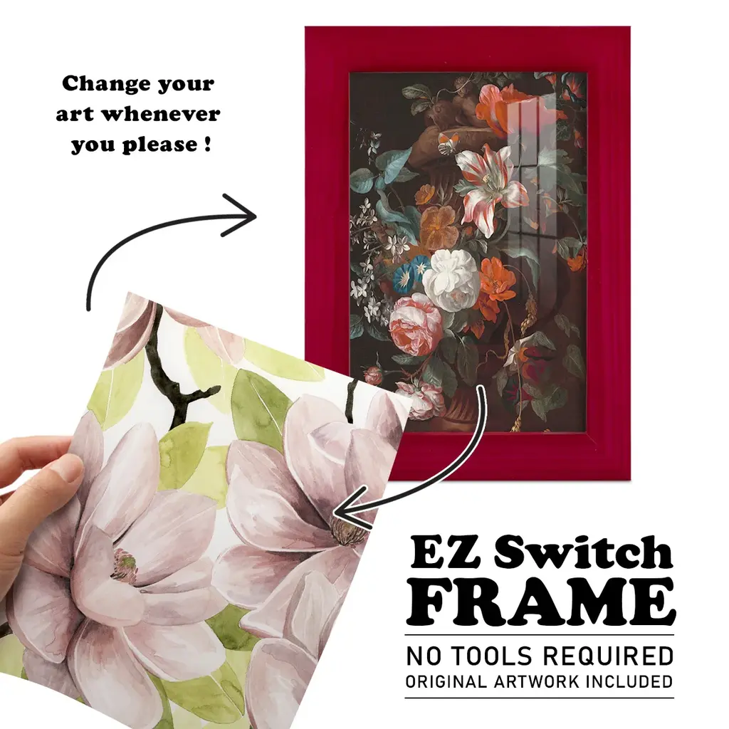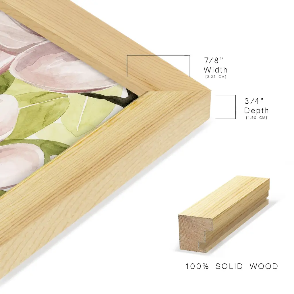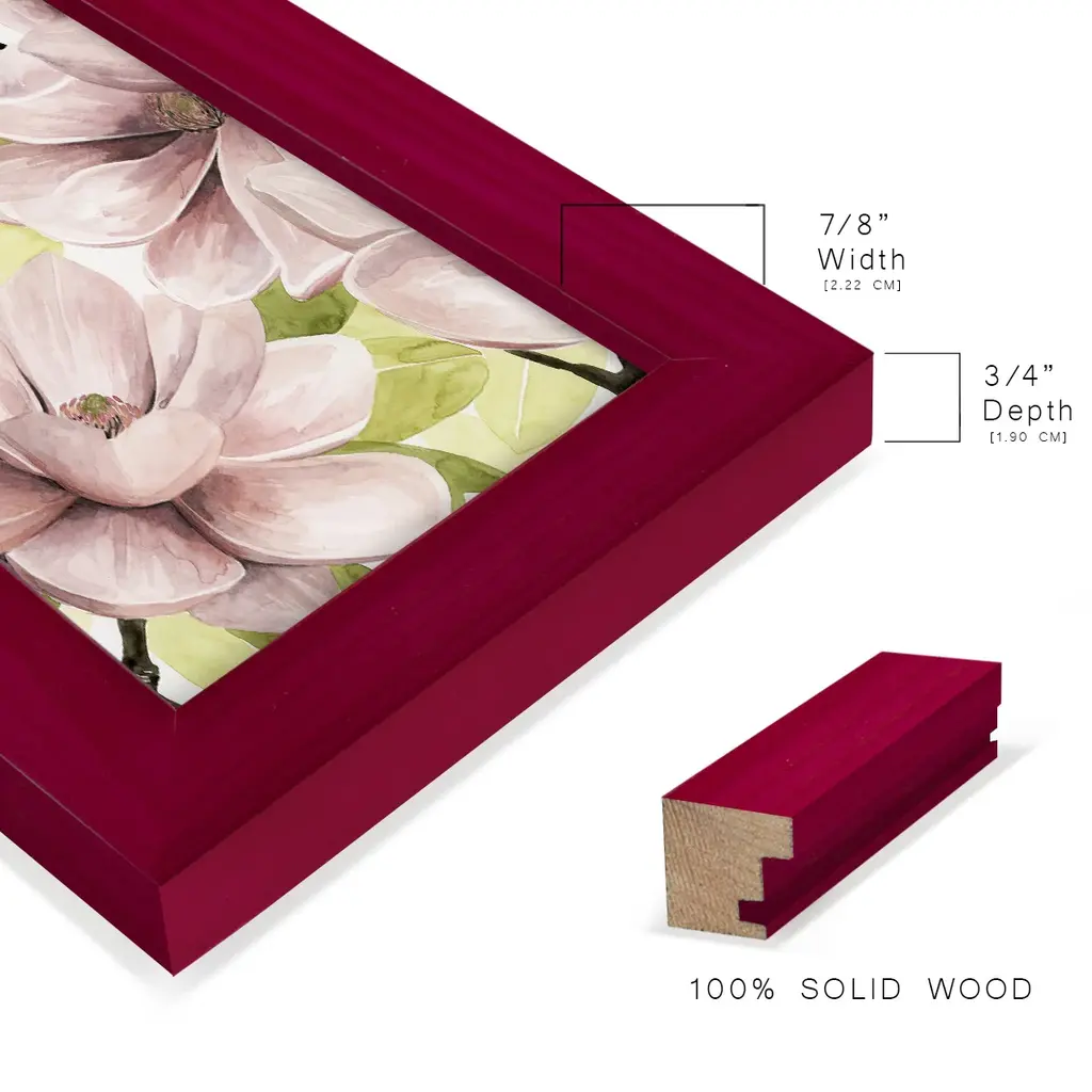 Blush Magnolia I -EZ SWITCH Framed Print w/glass-Cherry Red A delightful, framed print. Featuring a solid wood frame with real wood glass. This premium print is giclee quality. In addition, every frame features a removable back and table top stand. This allows you to change your art in the future or to just stand the art on a table for a new look. We are sure you'll enjoy our new series of EZ SWITCH Framed Art. Solid Wood Frame Real Glass Removable / Replaceable Art Built in Tabletop Stand Sizes range from 4x6 up to 12x15 - buy just one or pair them up as sets as you see fit.