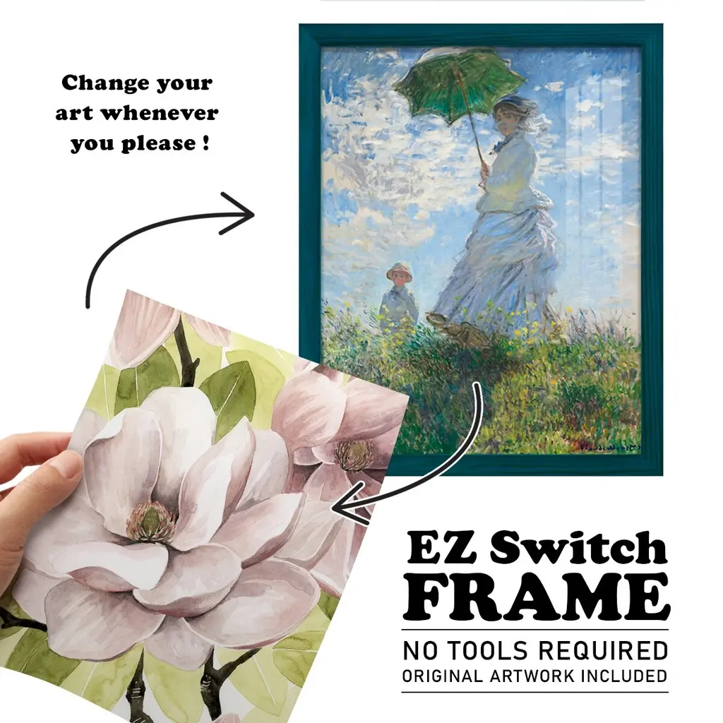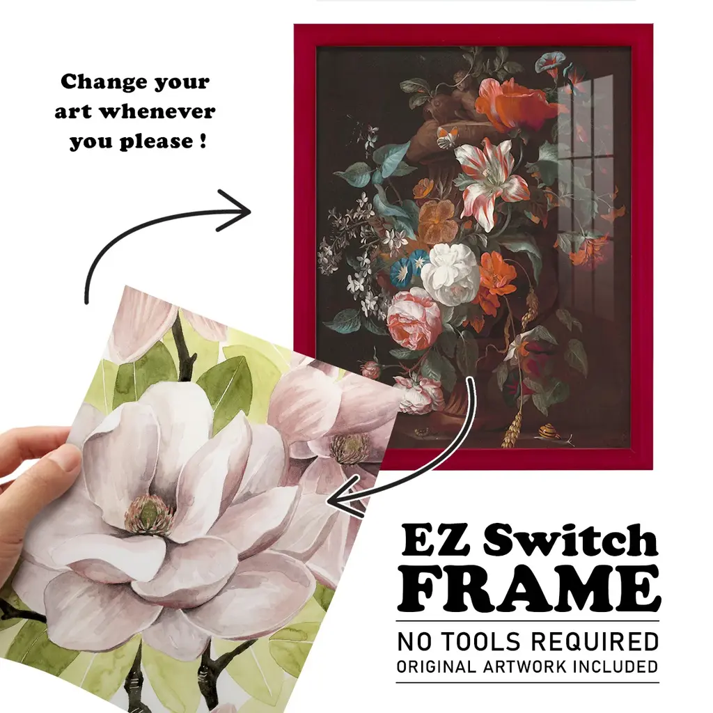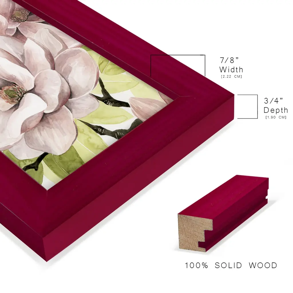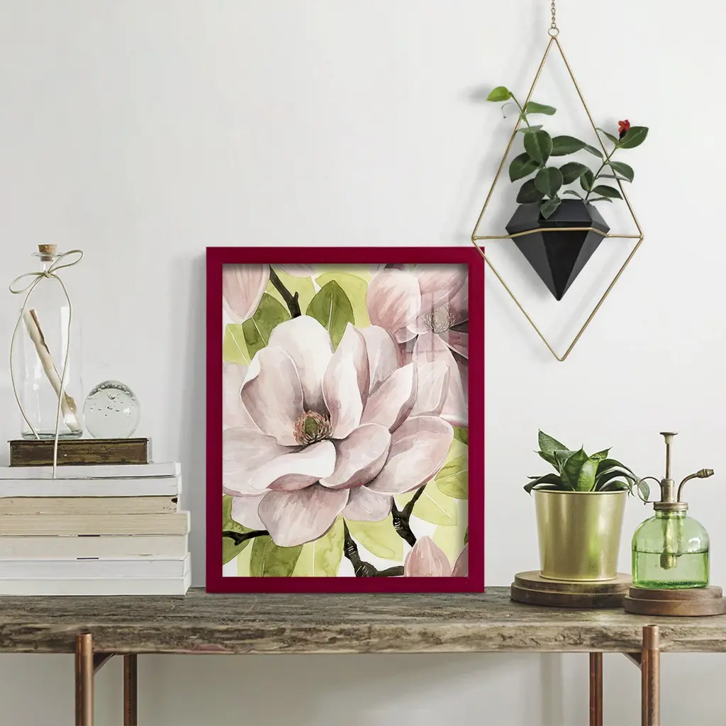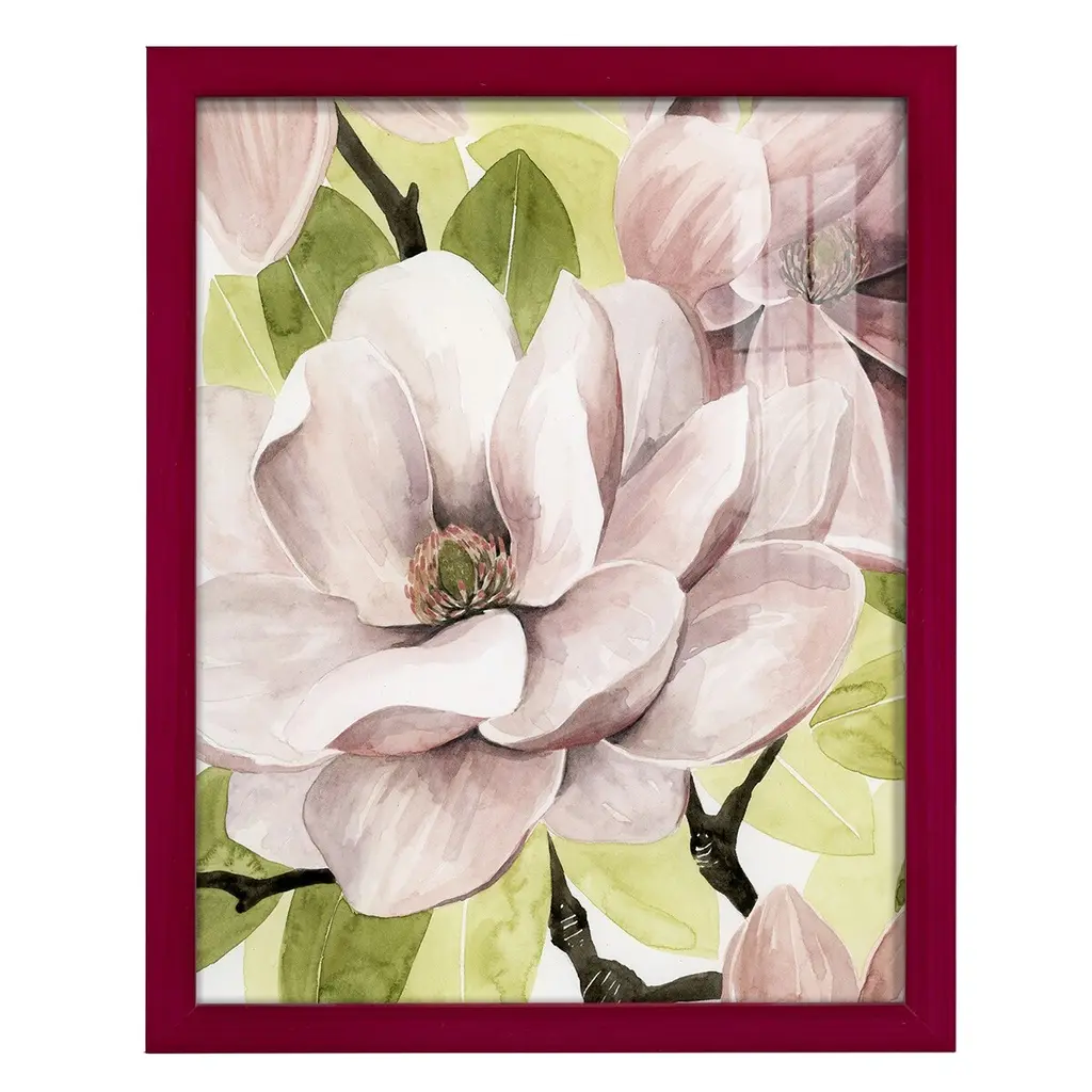 Blush Magnolia II -EZ SWITCH Framed Print w/glass-Cherry Red A delightful, framed print. Featuring a solid wood frame with real wood glass. This premium print is giclee quality. In addition, every frame features a removable back and table top stand. This allows you to change your art in the future or to just stand the art on a table for a new look. We are sure you'll enjoy our new series of EZ SWITCH Framed Art. Solid Wood Frame Real Glass Removable / Replaceable Art Built in Tabletop Stand Sizes range from 4x6 up to 12x15 - buy just one or pair them up as sets as you see fit.